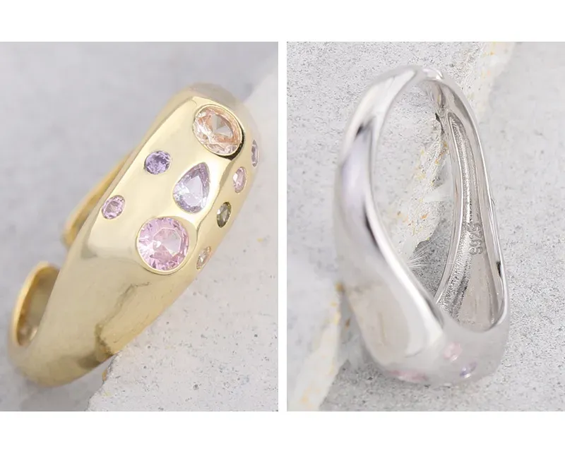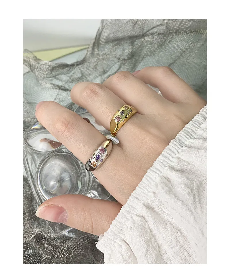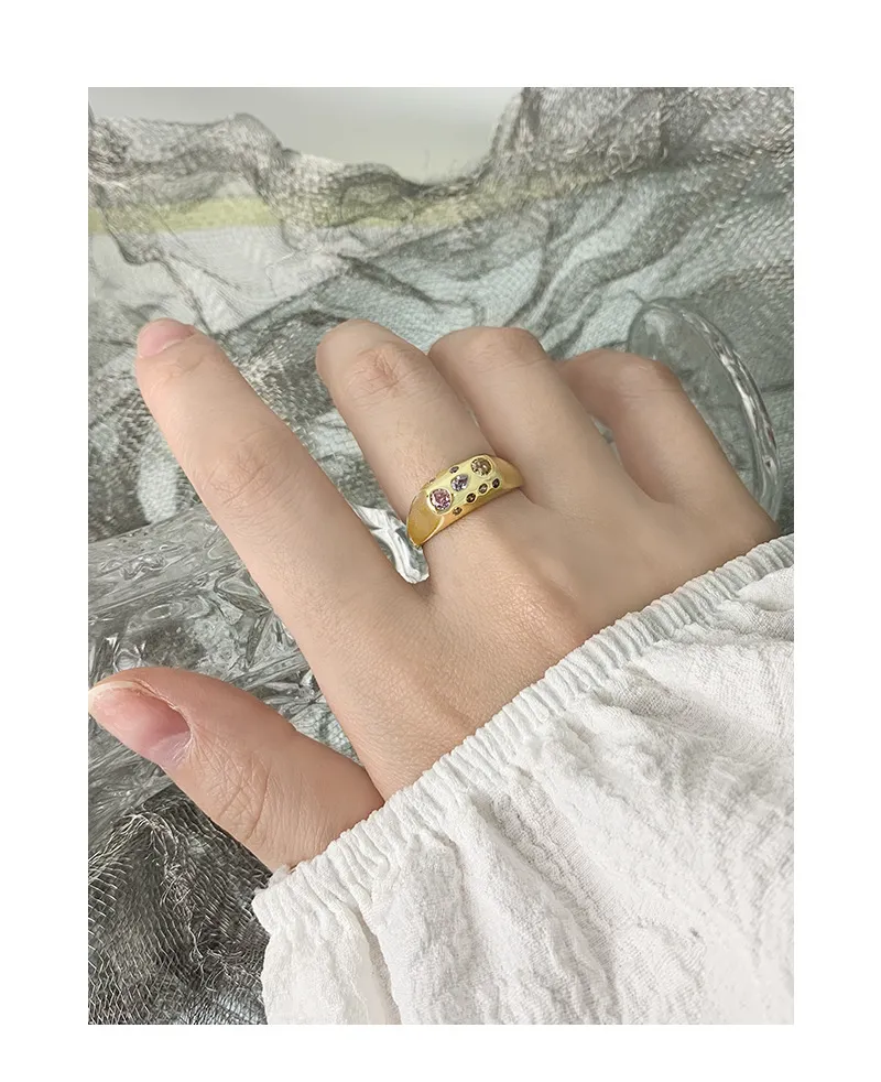 • Patterns & Textures: The ring’s smooth, reflective gold-toned surface is adorned with various sized and shaped gemstones, including captivating rounds, elegant teardrops, and subtle ovals. These gems are artfully arranged in an organic, scattered pattern, reminiscent of stars twinkling in the night sky or the mesmerizing dance of the aurora borealis.