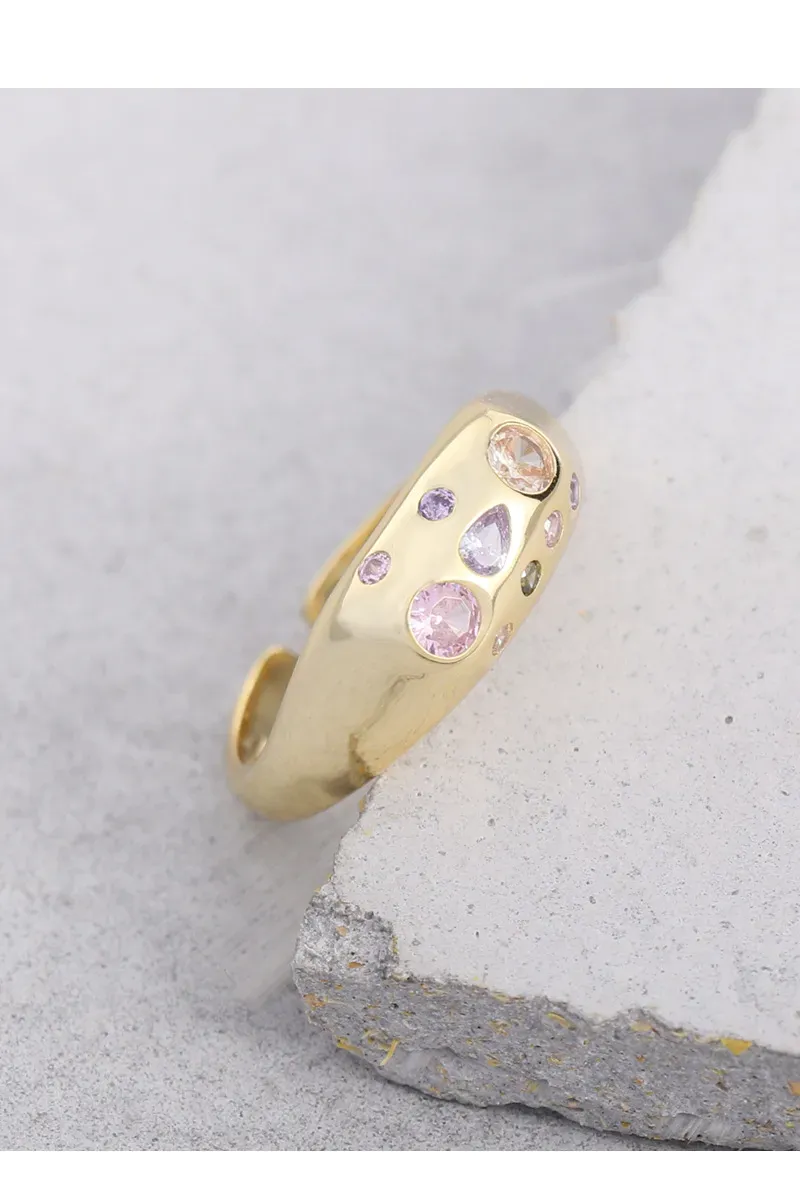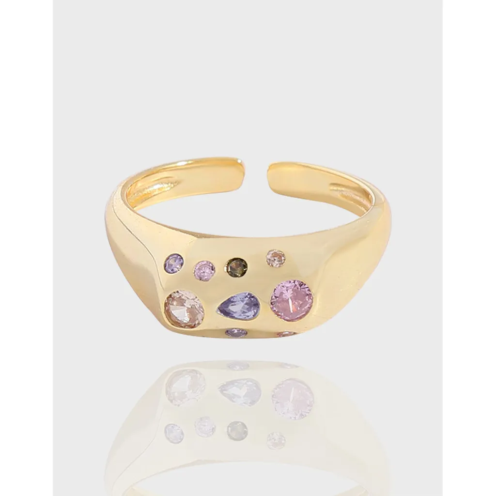 Embrace the enchanting spirit of the cosmos with this radiant adjustable ring. Crafted with a gleaming gold-toned finish, its broad, signet-inspired face becomes a canvas for a celestial scatteMadria Ring of multi-hued gemstones.