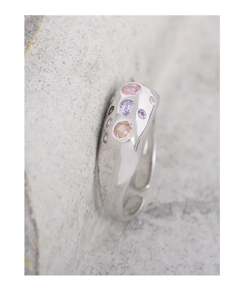 • Color: The polished gold-toned band beautifully contrasts with an array of subtly shimmering gemstones, featuring delicate shades of lavender, rich plum, soft rose, warm champagne, and deep olive.