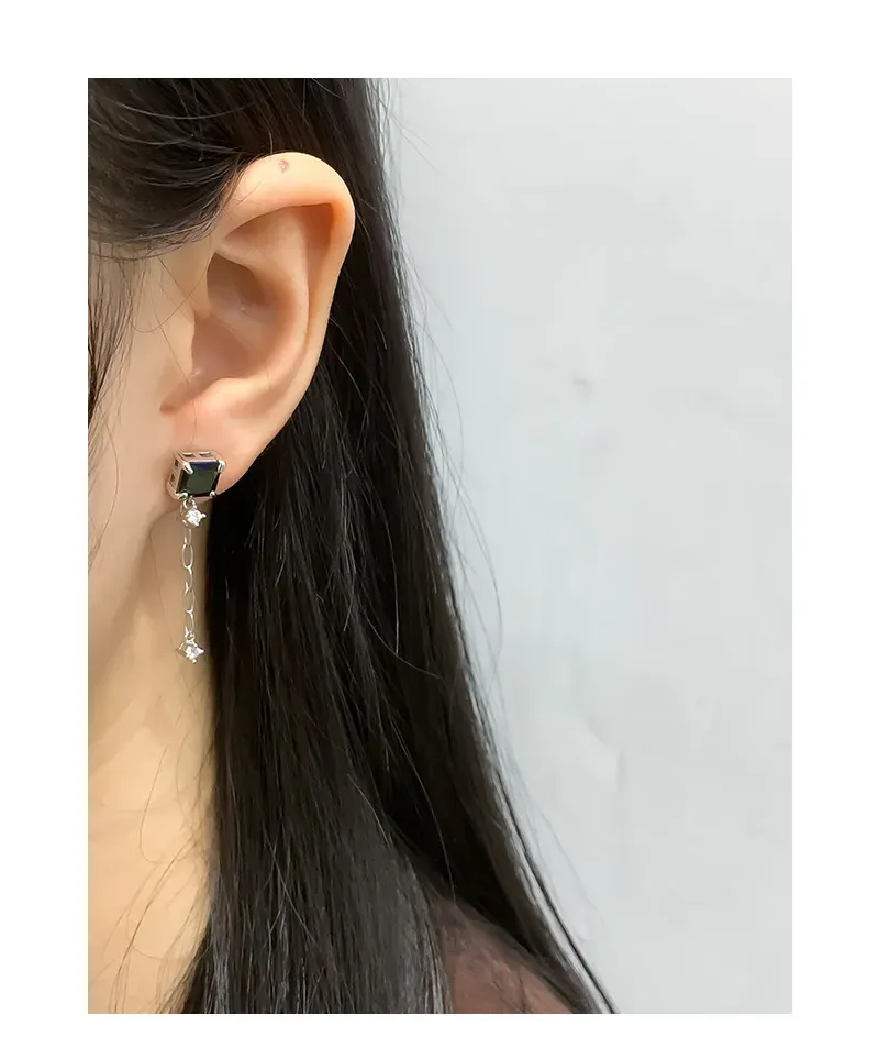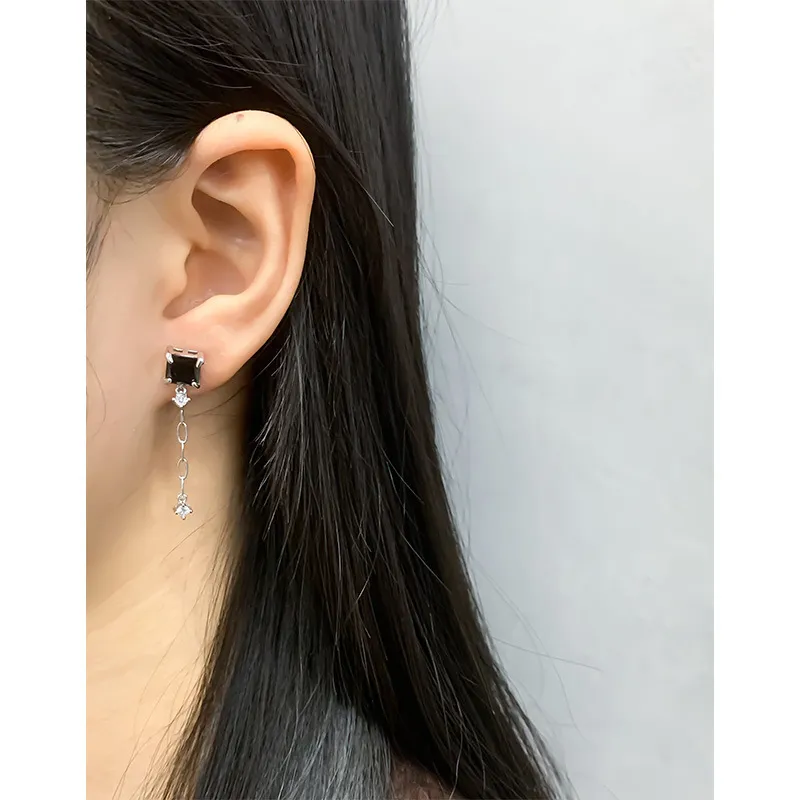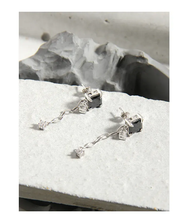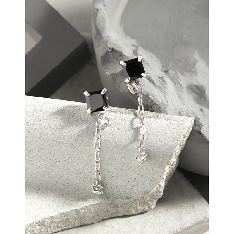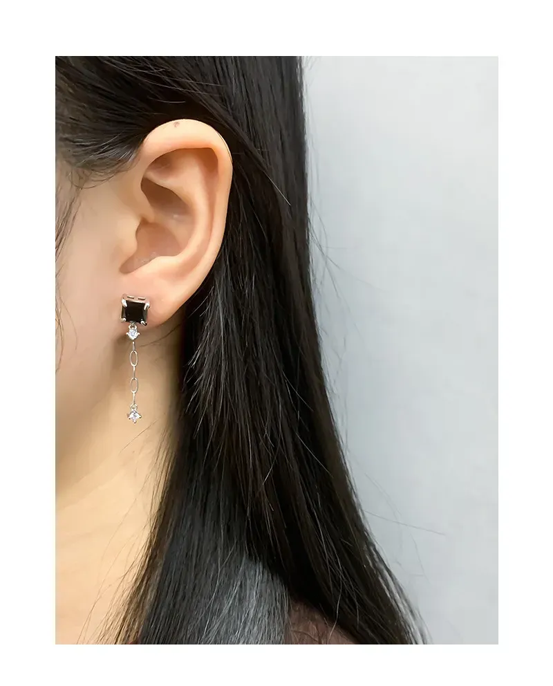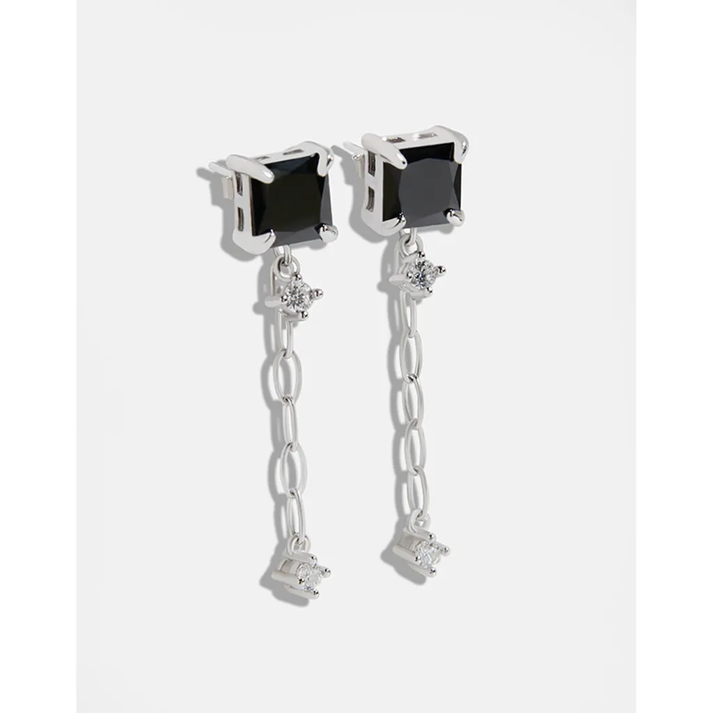 • Patterns & Textures: Each earring boasts a polished, square-cut black onyx stone, its smooth surface reflecting depth and mystery. Delicate oval chain links, crafted from lustrous silver-toned metal, create a continuous, fluid pattern. Completing the design are brilliant faceted zircons, set in subtle prongs, adding a captivating texture that mimics the twinkle of starlight and the imperfect beauty of nature’s patterns.