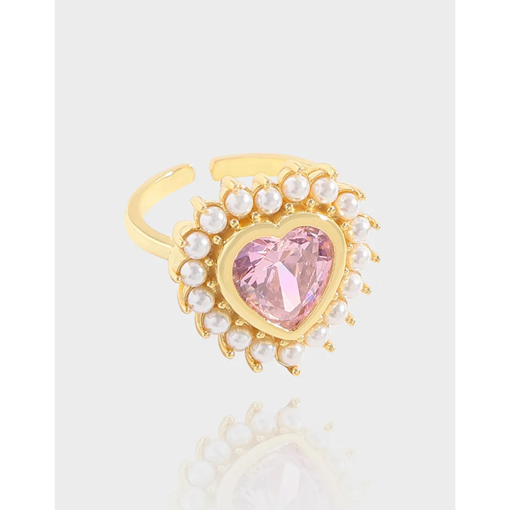 - Patterns & Textures: The smooth, polished gold-tone band leads to a bezel-set, faceted pink heart gem, designed to catch the light with every movement. Surrounding this central stone is a meticulously arranged pattern of spherical pearls, each contributing to a rich, dimensional texture. The open-ended band allows for an adjustable fit.