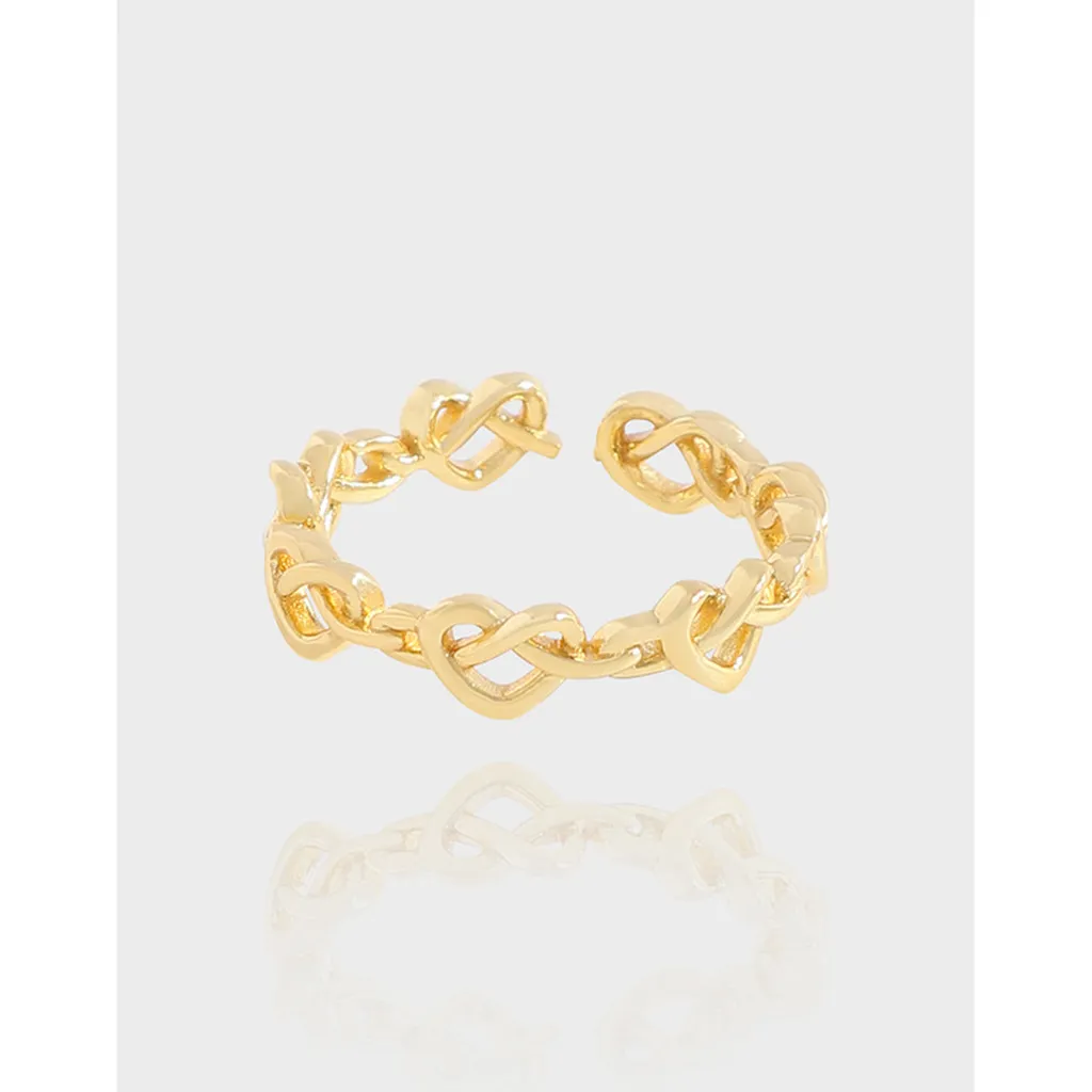 This exquisite ring features a radiant gold finish, showcasing a modern and delicate style. Its open-ended design offers adjustability for a comfortable fit. The unique pattern is formed by a continuous chain of intricately linked heart shapes, each a smooth, stylized loop that creates a charming and romantic motif. The entire Malessia Ring boasts a uniformly polished texture, giving it a luminous and sophisticated appeal.