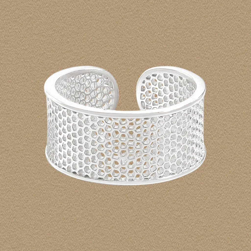 Patterns & Textures: The band is intricately detailed with a captivating hexagonal mesh pattern, reminiscent of nature’s perfect geometry like a honeycomb or a delicate network found in the wild. This openwork texture adds depth and visual interest, allowing for a dynamic play of light and shadow.
