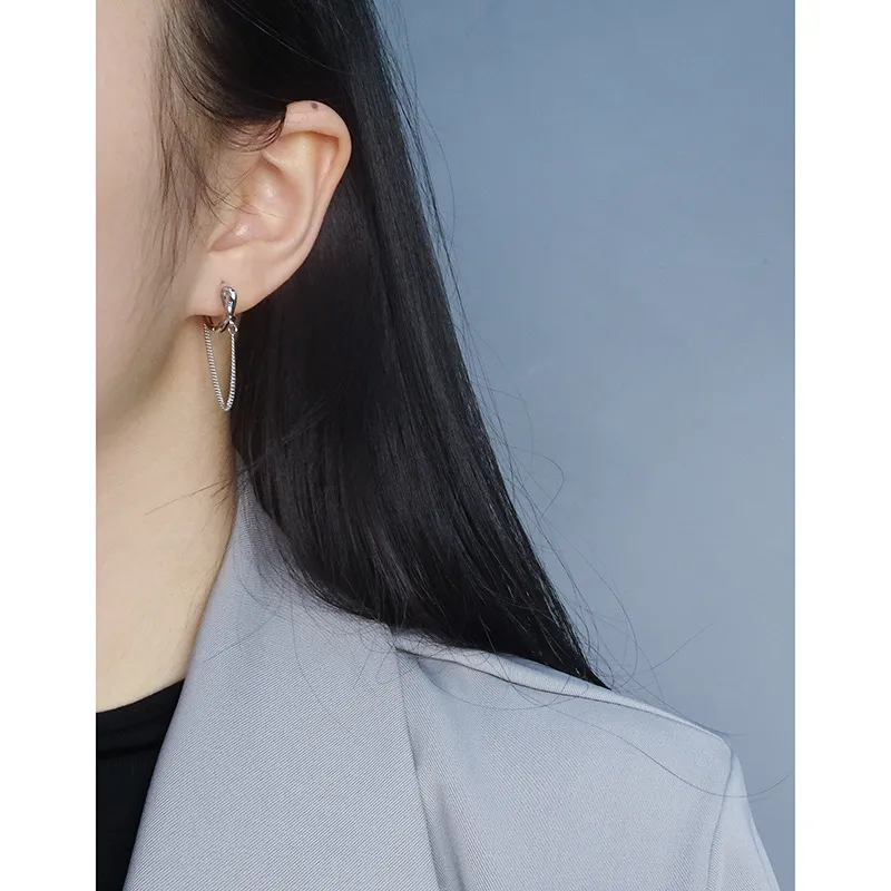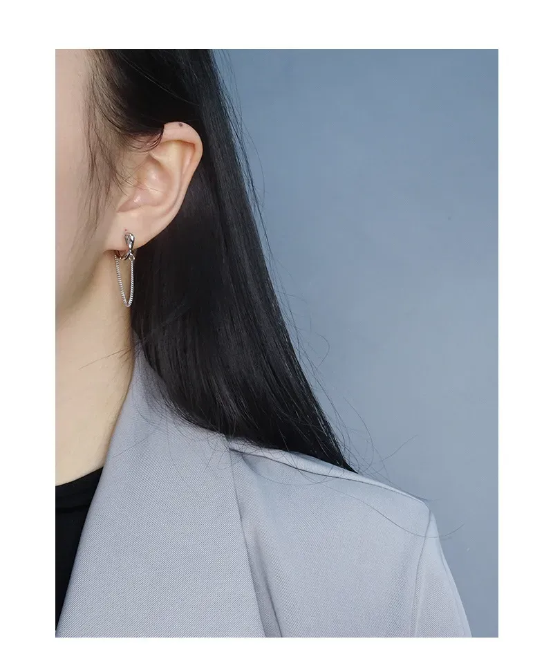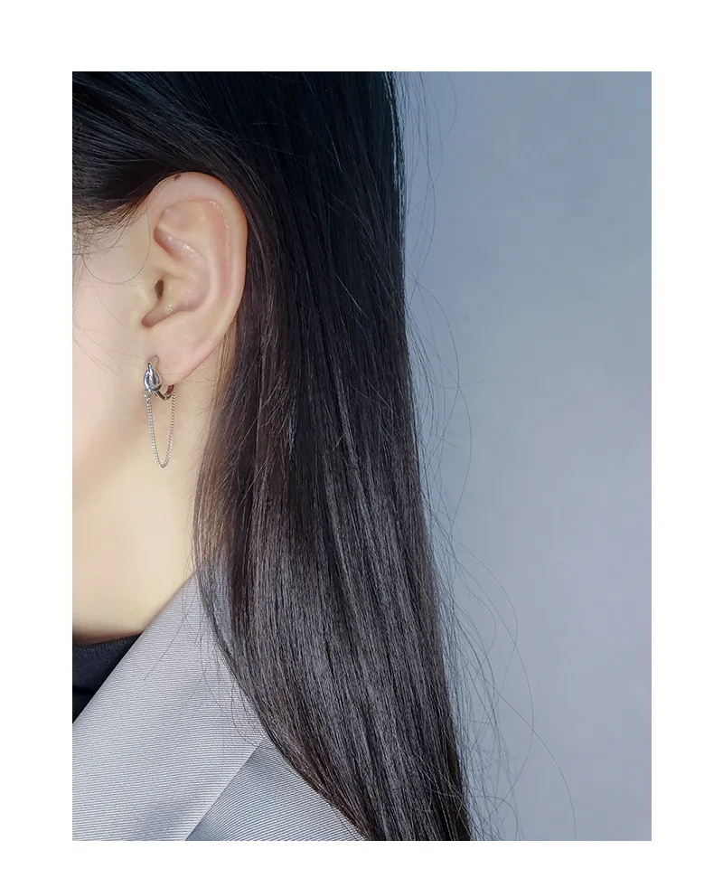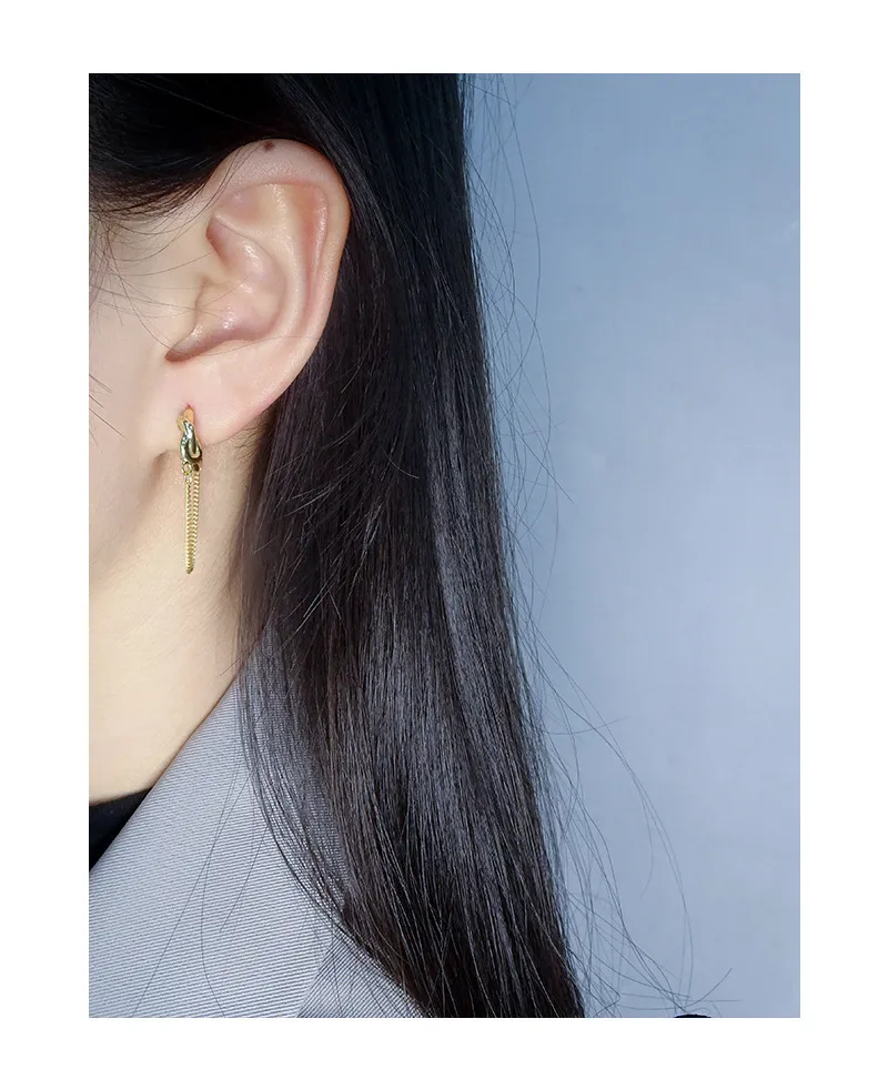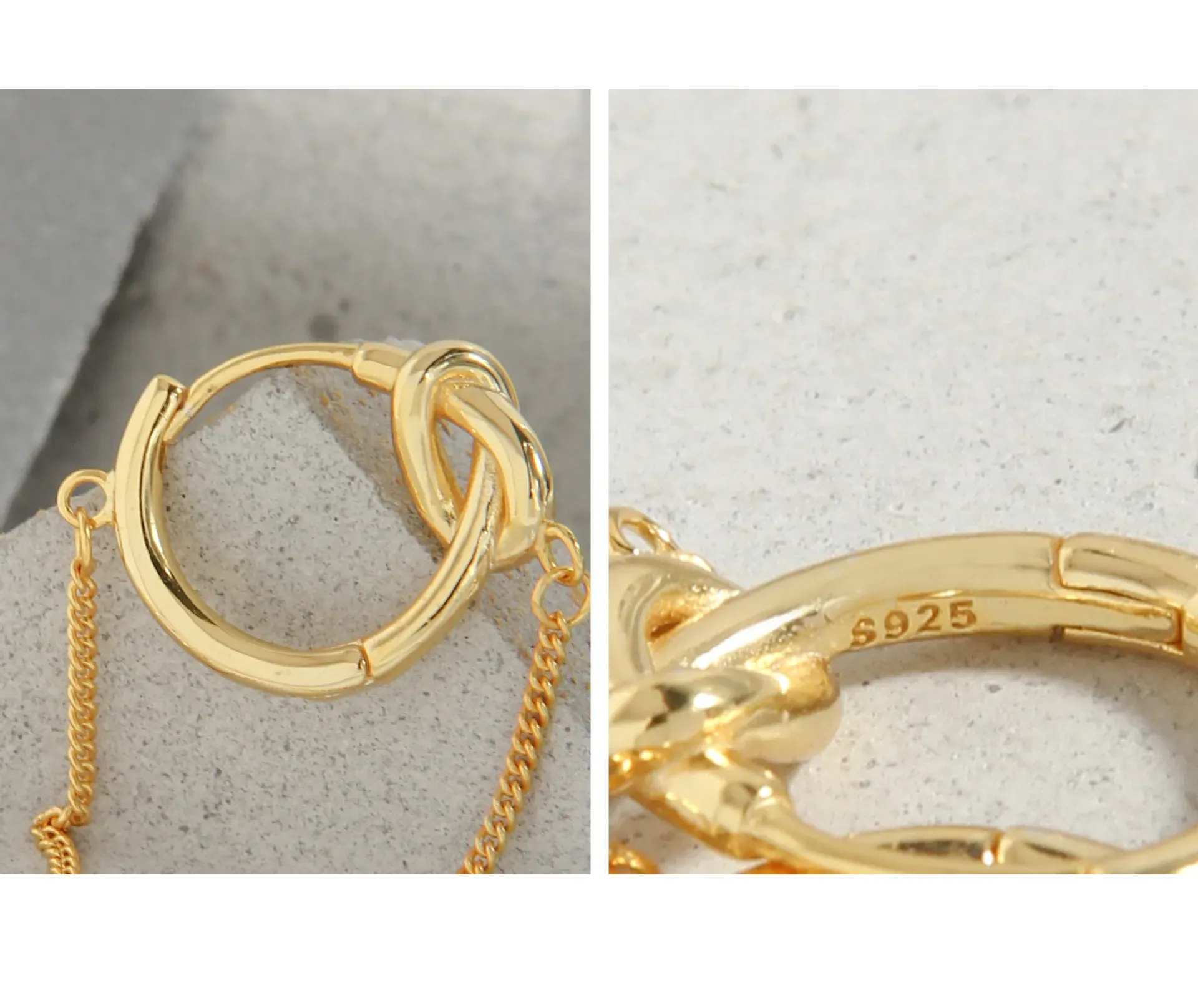 The smooth, highly reflective surfaces of the hoops and knot contrast beautifully with the subtle, intricate texture of the chain’s fine links, creating a dynamic interplay of light and form. These Marina Joyeuse Earrings offer a delicate balance of modern style and timeless allure, perfect for enhancing any ensemble with their celestial shimmer.