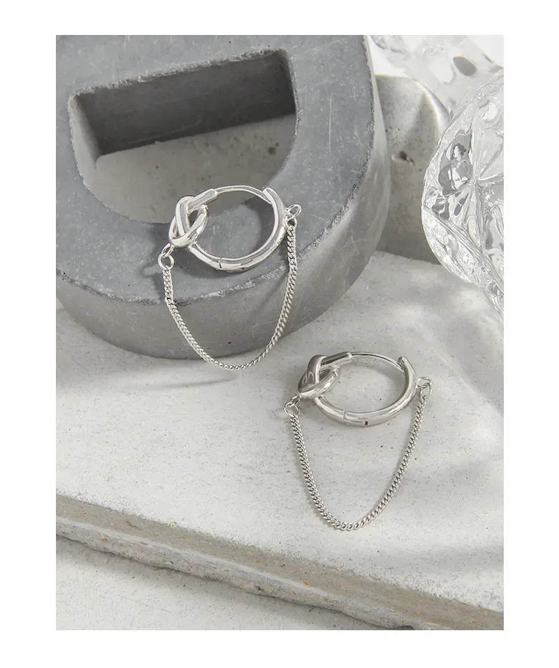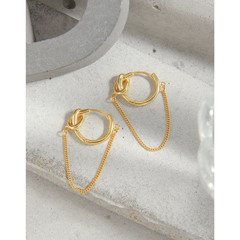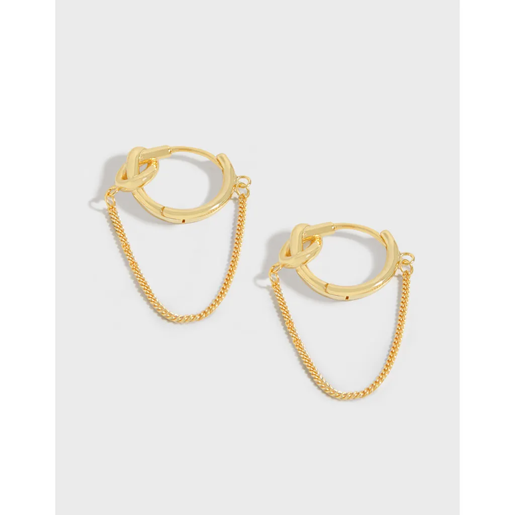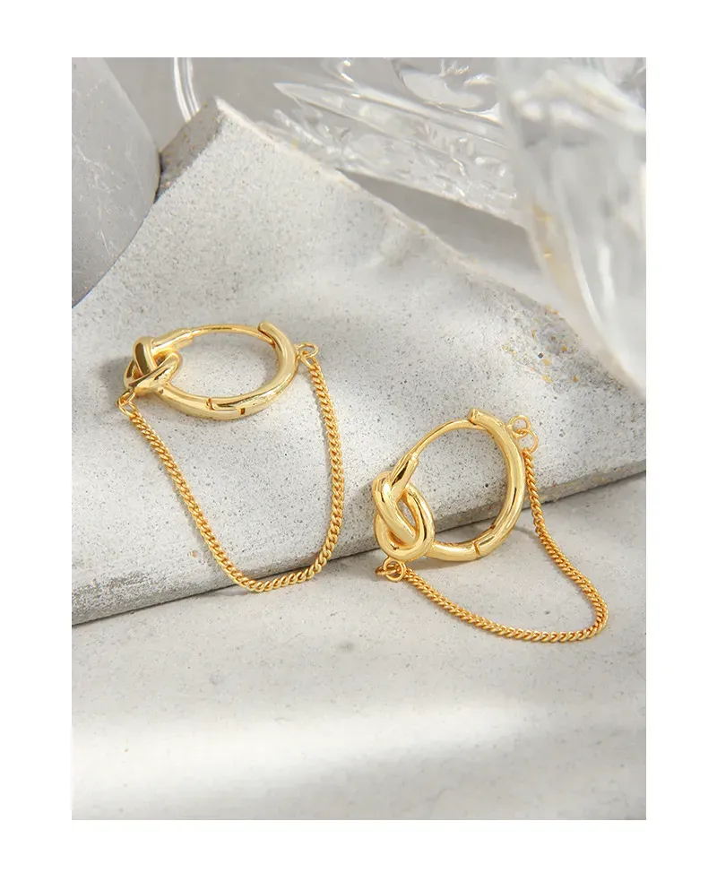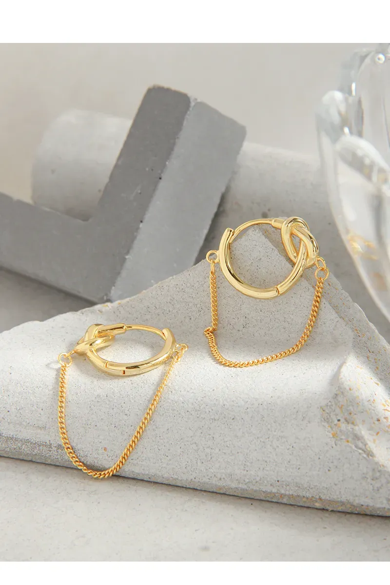 Discover elegance with these captivating hoop earrings, meticulously crafted from luminous, polished gold. The design features a distinctive knot detail integrated into the top of each hoop, embodying a sense of fluid, organic artistry. A delicate chain gracefully drapes below, connecting two points of the hoop and adding a touch of contemporary flair.