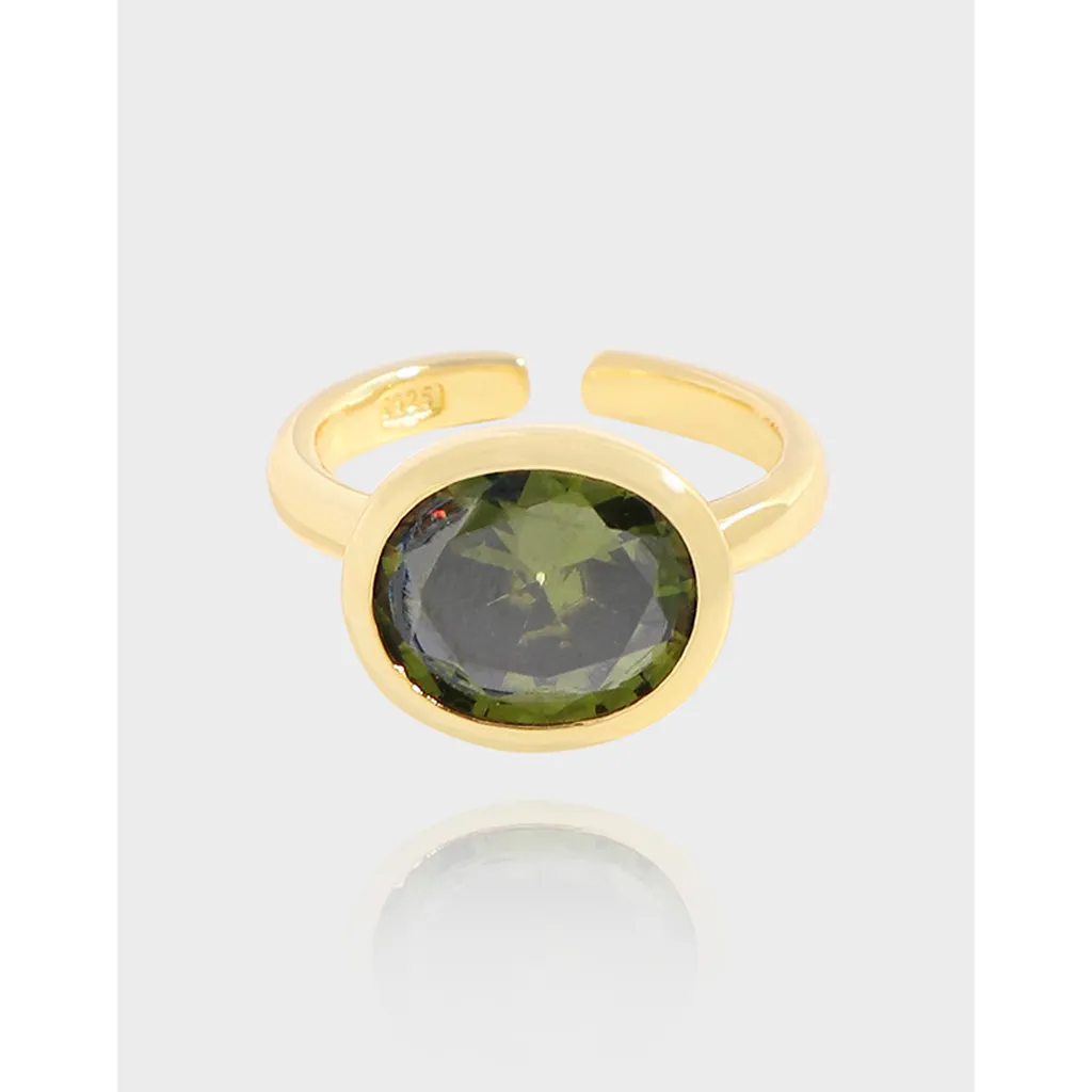 - Color: The lustrous gold-plated band elegantly complements the deep, earthy olive-green gemstone, creating a harmonious blend of celestial warmth and natural depth.