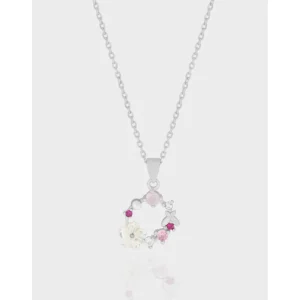 This enchanting necklace captures nature’s delicate artistry with its sterling silver base and a charming wreath-inspired pendant.