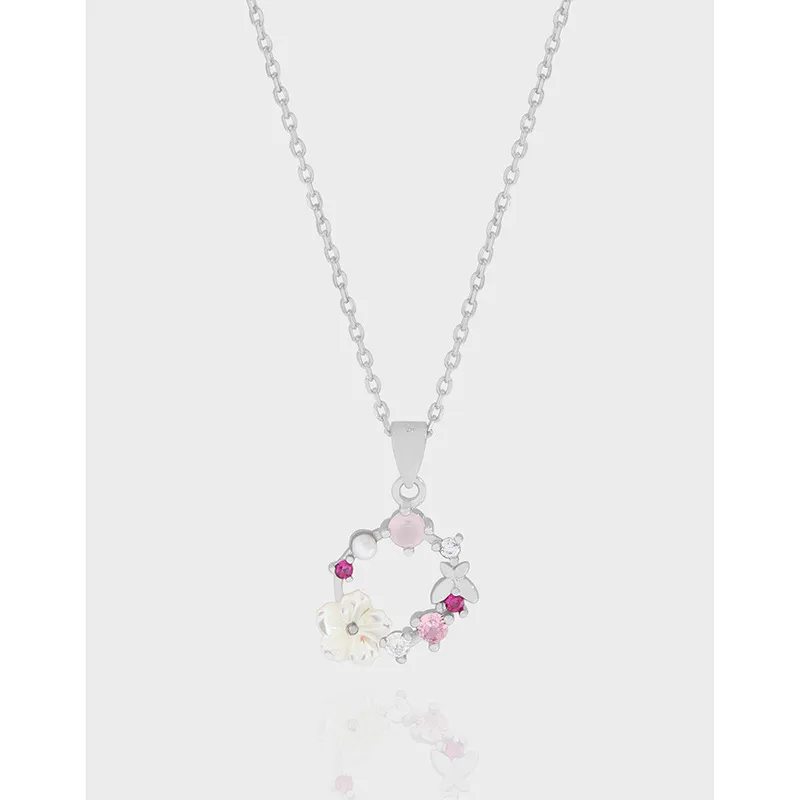 - Color: The polished silver chain and pendant frame beautifully complement an array of pastel pink, vibrant fuchsia, and clear sparkling gemstones. A creamy white flower and a lustrous pearlescent bead add a soft, organic touch, while a subtle pink cabochon completes the harmonious palette.