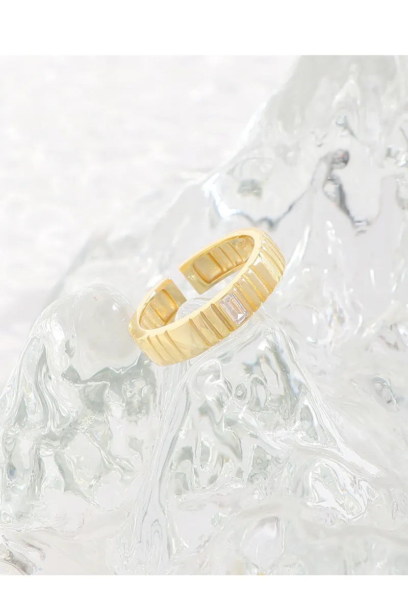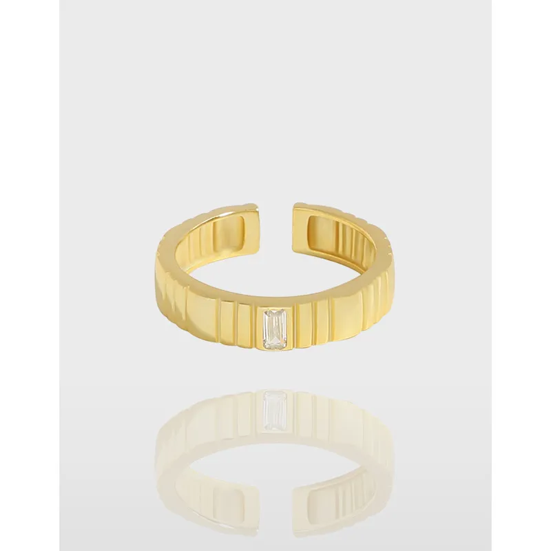 Inspired by the ethereal glow and fluid beauty of the natural world, this exquisite open-ended ring from Malisse is crafted in radiant gold. Its contemporary design features a captivating ridged texture along the band, offeMelanie Ring a delicate balance of raw artistry and refined elegance. At its heart, a single, clear baguette-cut gemstone is meticulously set, symbolizing the pure light and cosmic beauty that defines our inspiration.
