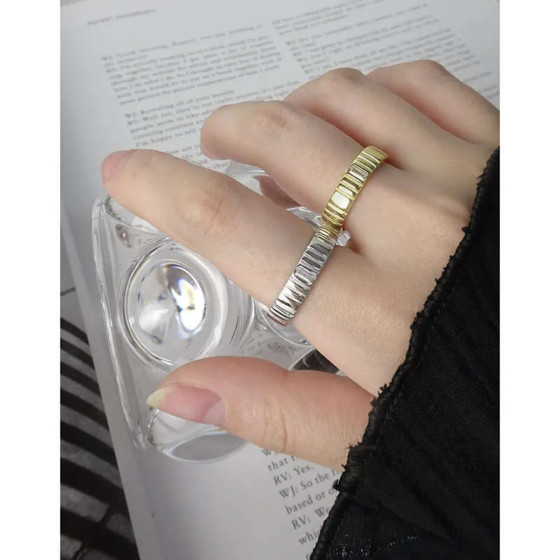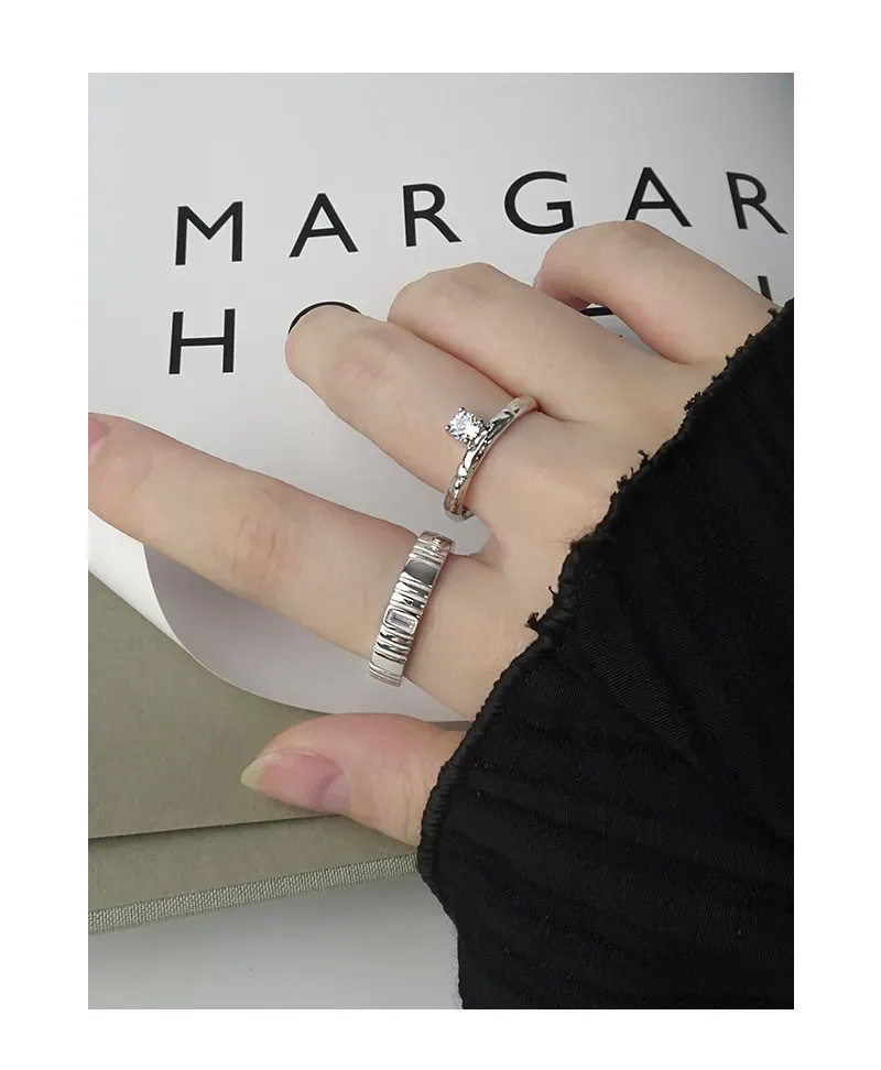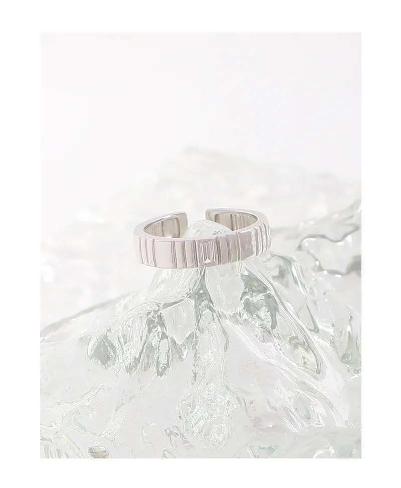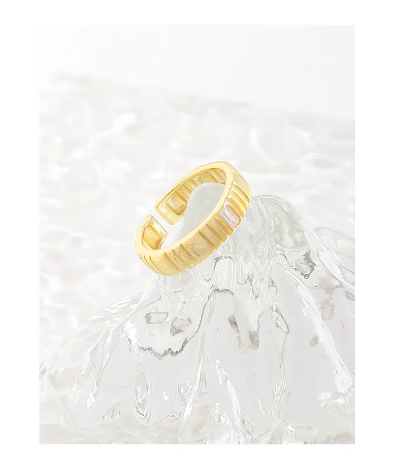 • Texture & Pattern: The distinctive ridged band creates an engaging tactile experience, reminiscent of natural patterns and the subtle, imperfect beauty found in geological formations. The clear baguette stone adds a focal point of celestial light.