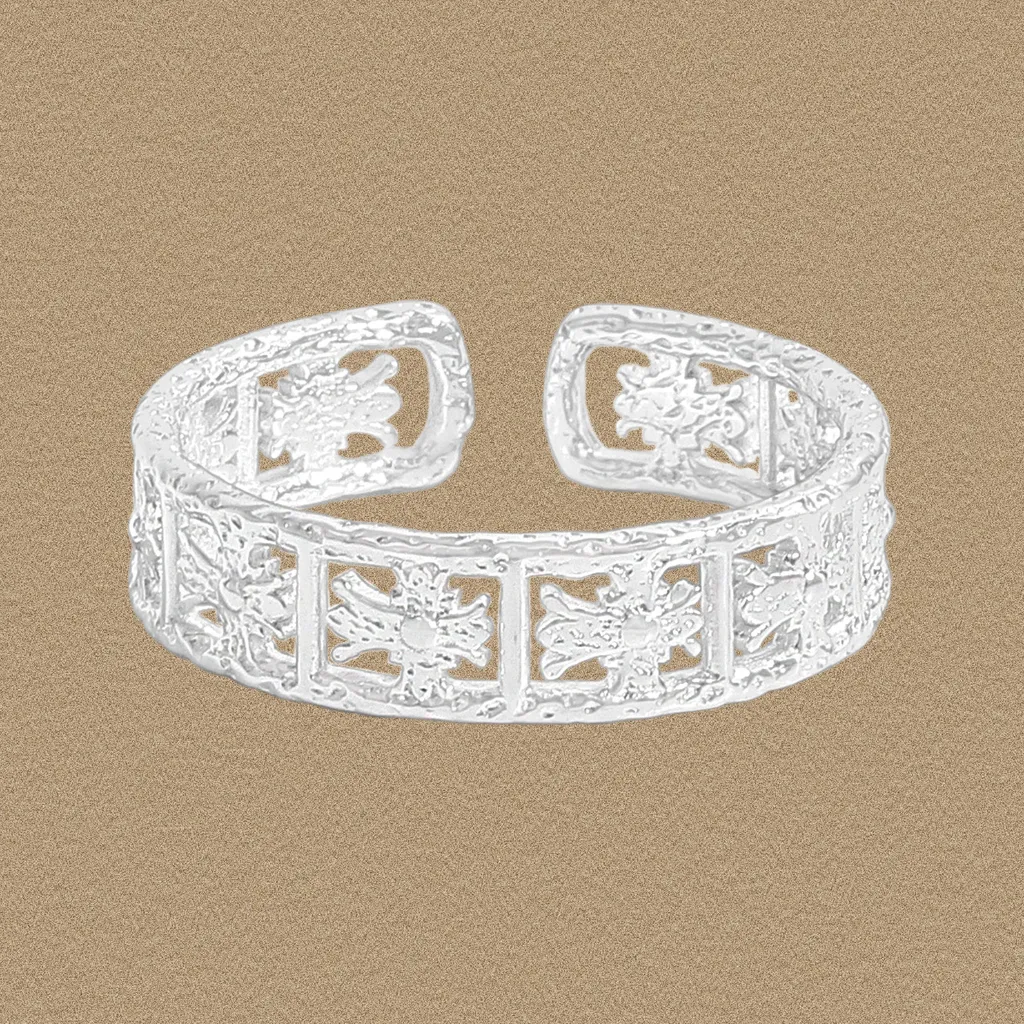 - Patterns & Textures: The band is adorned with an alluring raw, textured finish, mirroring the authentic beauty of natural elements. Intricate openwork patterns, framed delicately, depict stylized botanical motifs, celebrating the imperfect yet captivating patterns found in nature’s embrace.