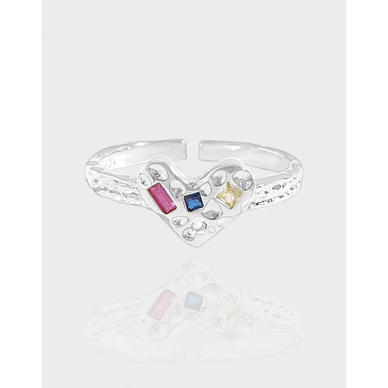 - Color: The radiant silver band features an open, adjustable design, embracing a focal heart adorned with a vibrant palette. It showcases a striking fuchsia rectangular gemstone, a deep celestial blue square gem, and a bright pale yellow square gem, complemented by smaller shimmeMenaia Ring clear stones, evoking the luminous hues of the night sky.