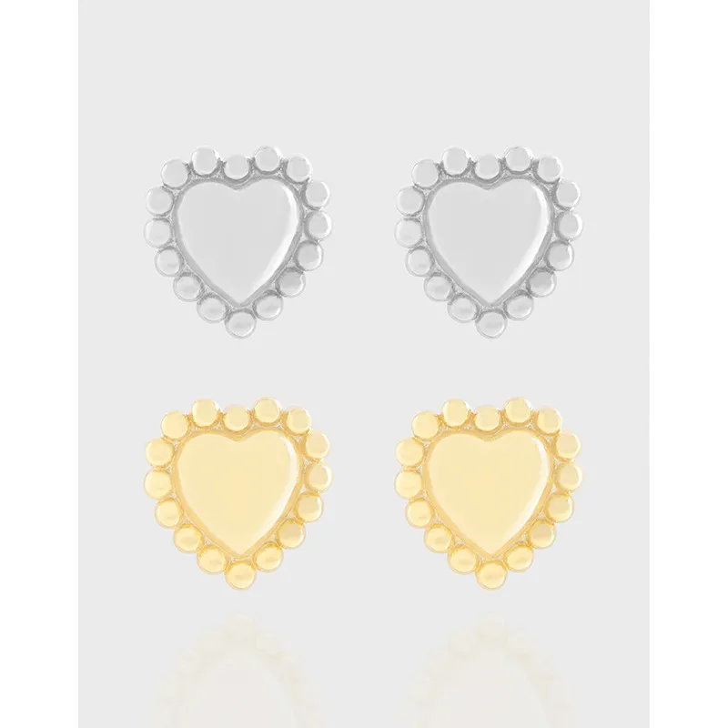 Discover our charming heart-shaped stud earrings, available in two exquisite finishes: gleaming silver and radiant gold. Each earring features a beautifully polished, smooth heart at its core, creating a lustrous focal point. This central design is elegantly encircled by a delicate border of uniform, spherical beads, adding a distinctive textured pattern and enhancing its romantic silhouette.