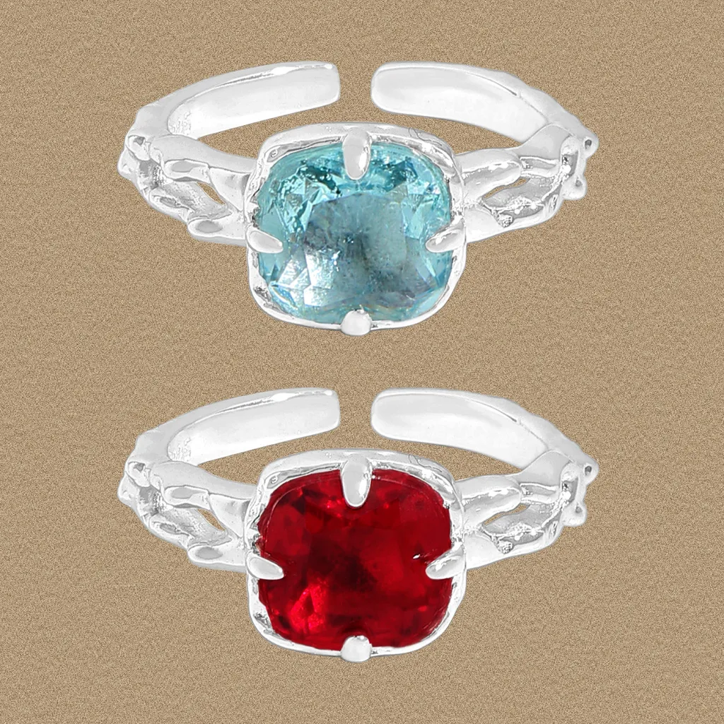 - Color: A brilliant, faceted light blue gemstone takes center stage, reminiscent of a clear sky or tranquil waters. Its serene hue is beautifully complemented by the gleaming silver-toned metal of the band.
