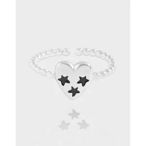- Patterns & Textures: The band is intricately textured with uniform spherical beads, reminiscent of delicate stardust. This raw texture leads to a smooth, elegant heart shape, within which three precisely cut star patterns shine brightly, mirroring nature’s imperfect beauty and the patterns of the night sky.