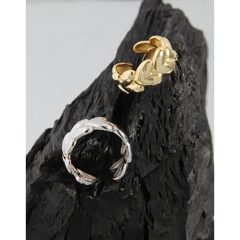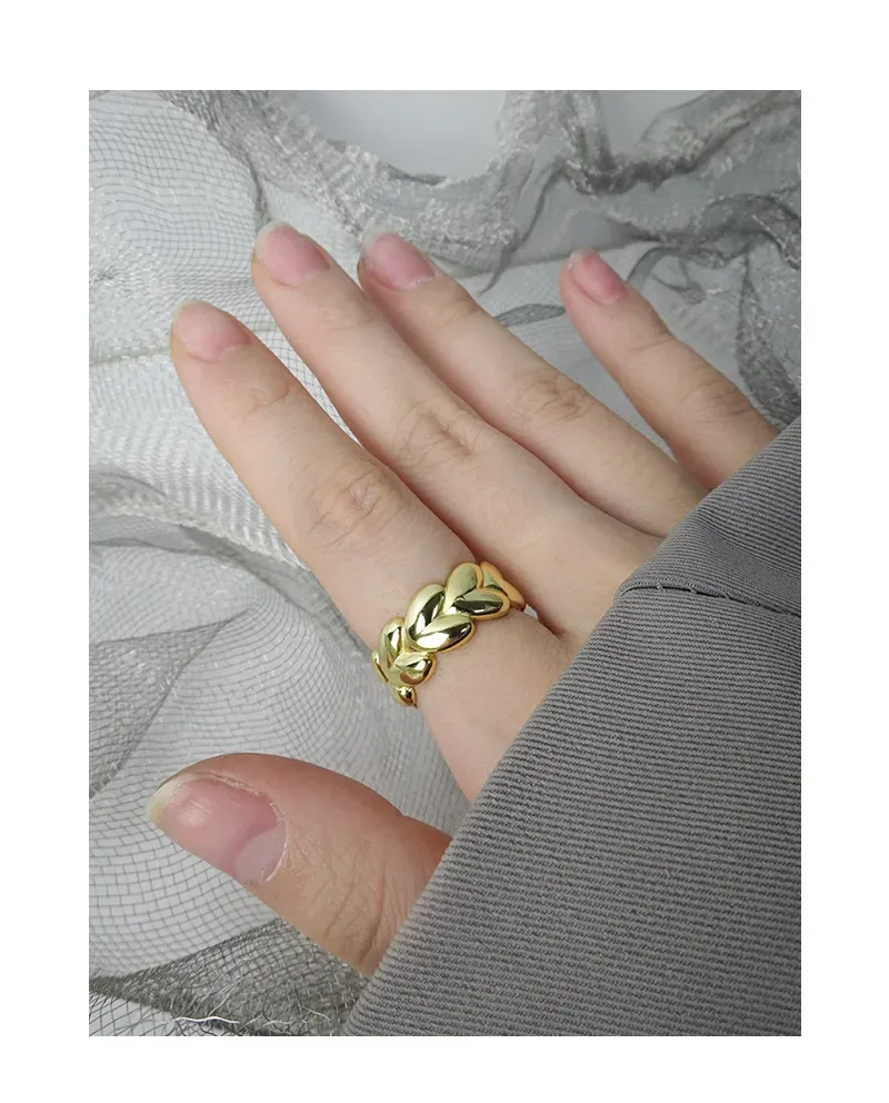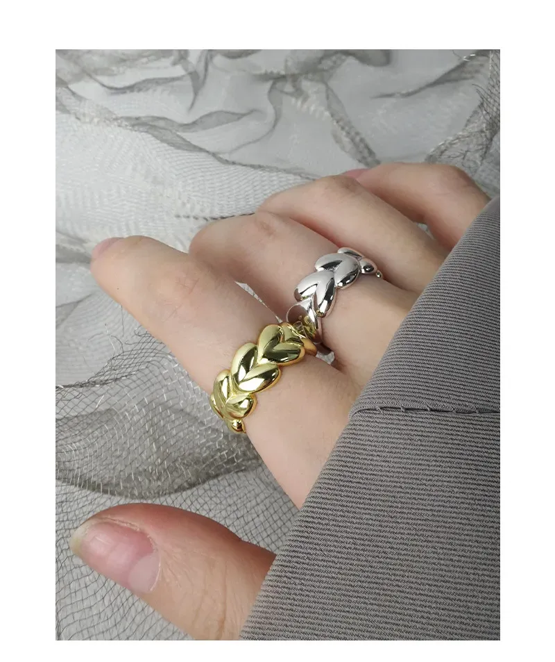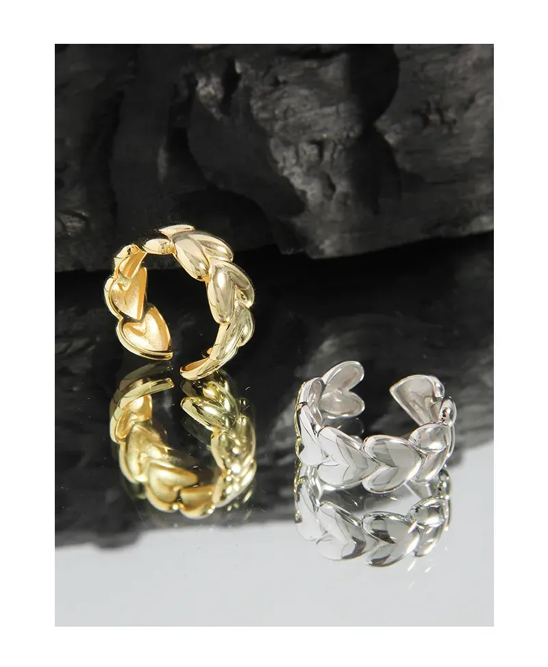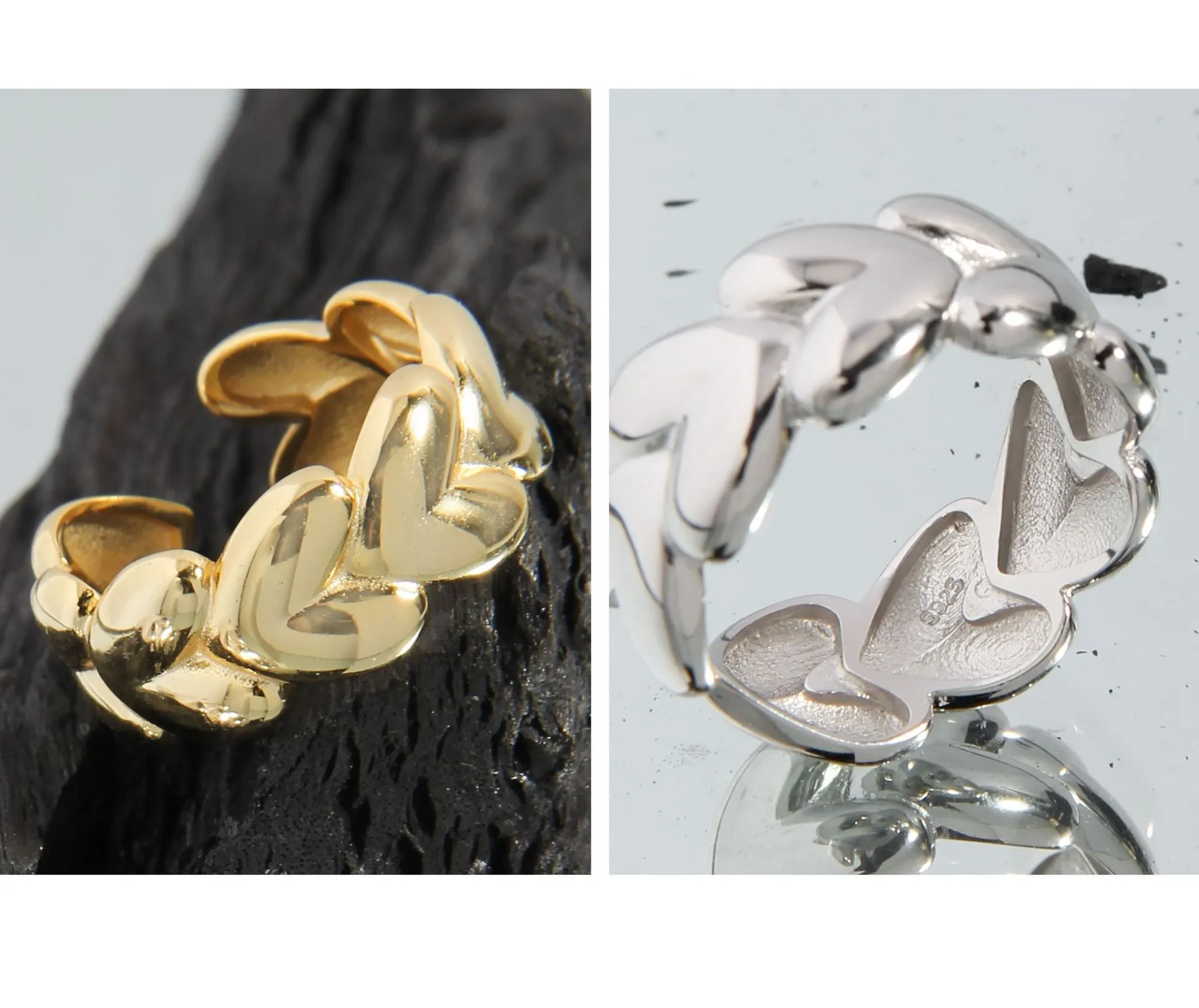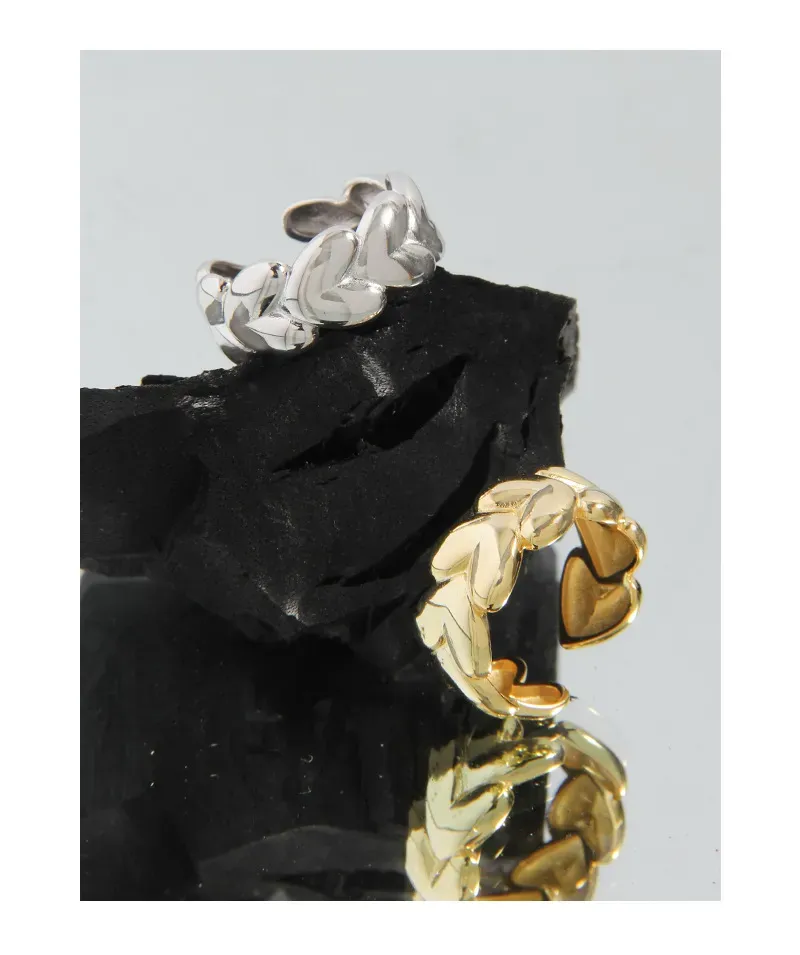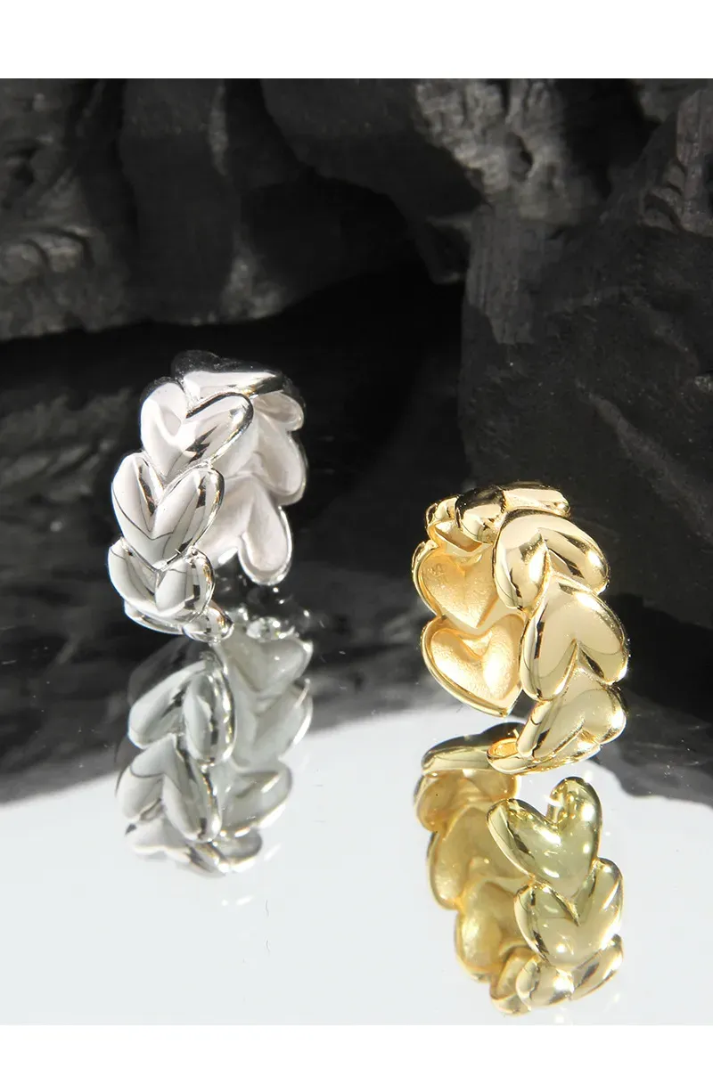 • **Patterns or Textures:** The band is artfully composed of interconnected, puffed heart shapes, forming a seamless and appealing **pattern**. Each heart features a smooth, highly polished **texture**, reflecting light with a captivating gleam, embodying the fluid beauty found in nature’s artistry.