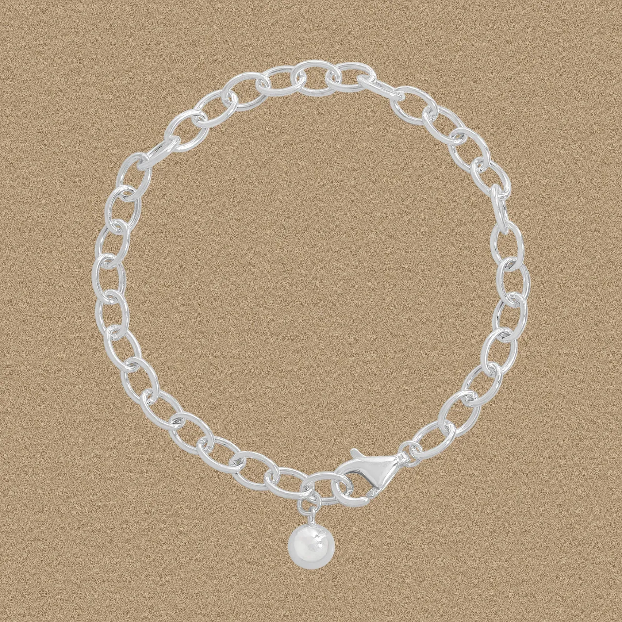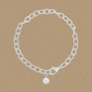 Patterns & Textures: The chain consists of smooth, polished oval links that interlock seamlessly, creating a sleek and reflective surface. Each link contributes to the bracelet’s flowing form. Suspended gracefully is a perfectly spherical pearl, boasting a lustrous, unblemished texture that embodies nature’s imperfect beauty and depth.