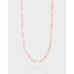 Embrace the enchanting allure of nature with this exquisite beaded necklace. Crafted with a delicate balance of raw textures and fluid shapes, it features a captivating array of irregular, flat pink beads, ranging in soft, ethereal hues. These unique beads evoke the imperfect beauty of nature’s patterns, creating an organic and natural aesthetic.