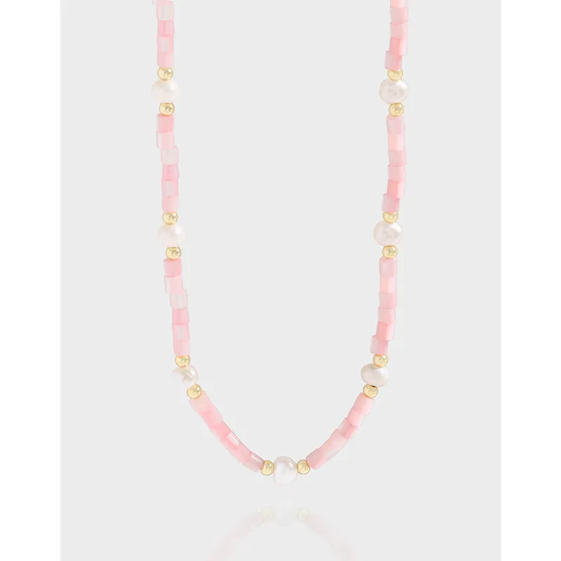 • Color: Soft, ethereal pink beads in varied shades, creamy white freshwater pearls, and warm golden accents.