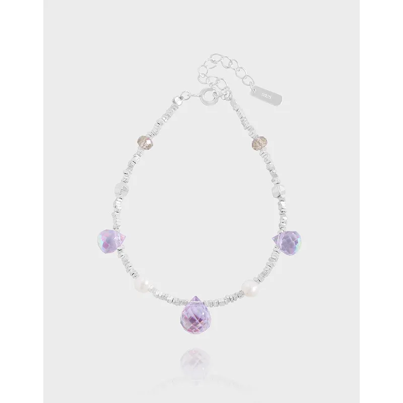 - Color: This Myrinthra Bracelet presents a captivating palette, centered around iridescent lavender and purple faceted beads that shimmer with a spectrum of pink, blue, and gold, evoking the aurora borealis. These are beautifully accented by luminous creamy white pearls, subtle champagne-hued crystals, and lustrous silver-toned beads.