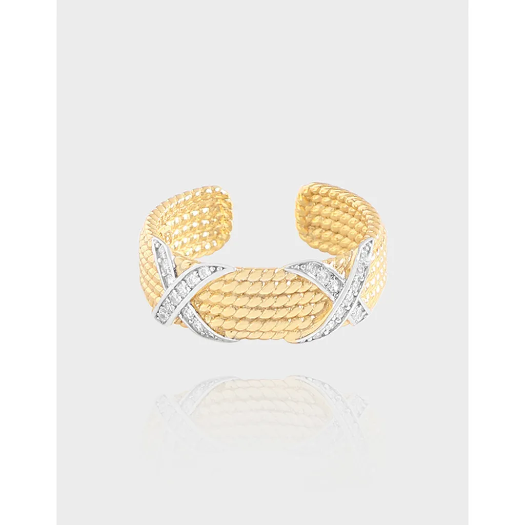 - Patterns & Textures: The primary golden band features an intricate, organic braided texture, reminiscent of woven natural fibers or the delicate patterns found in the earth. This rich texture beautifully complements the smooth, polished surface of the diamond-embellished “X” motifs, creating a harmonious balance of raw and refined elements.