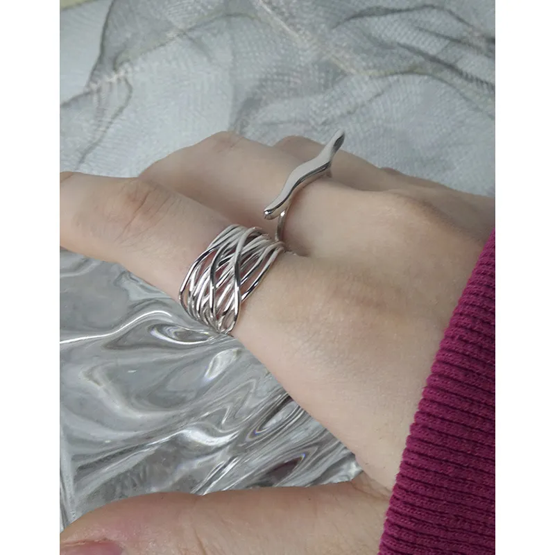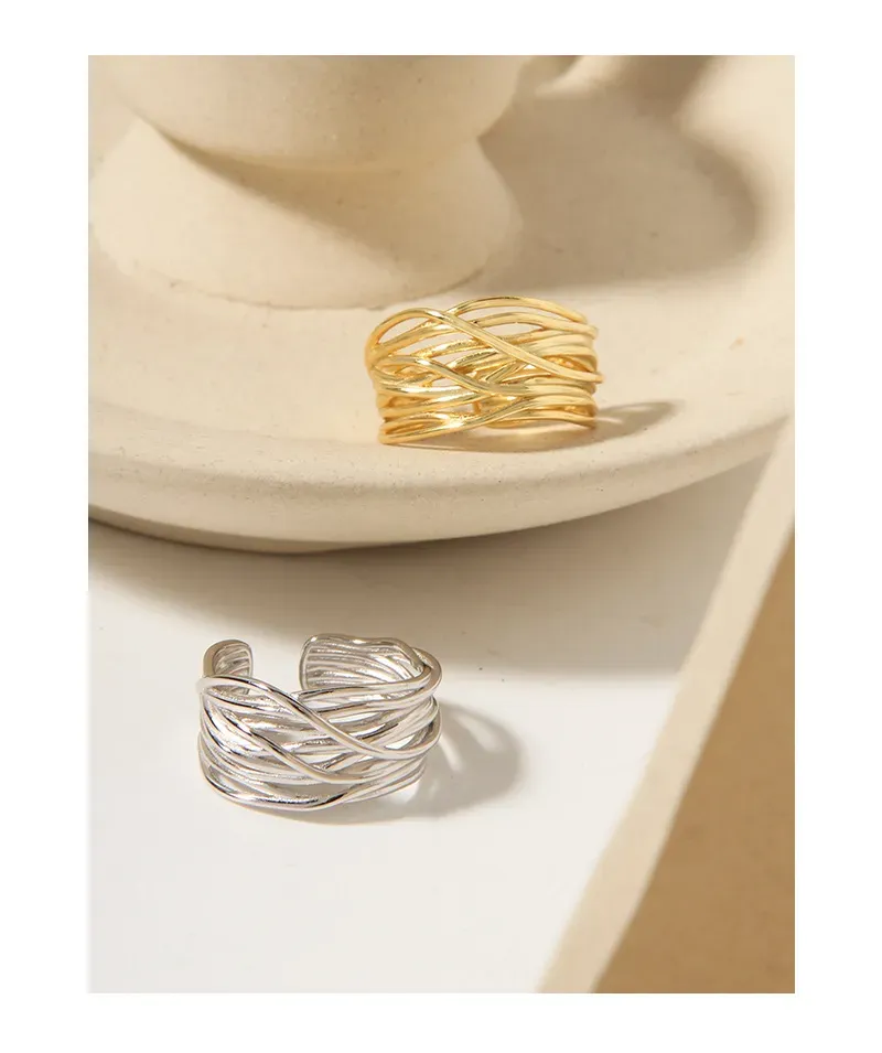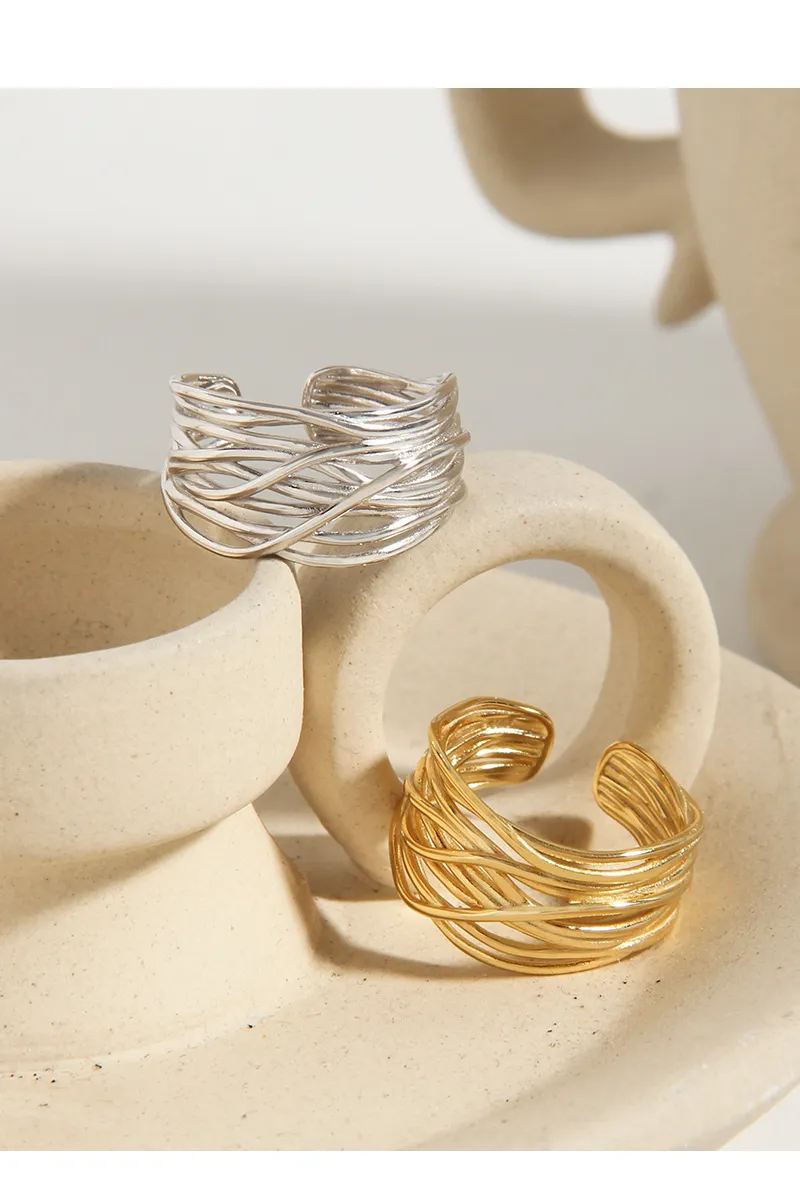 • Style: A bold yet elegant open-ended statement ring, designed for adjustability and a comfortable fit, reflecting a modern and organic aesthetic.