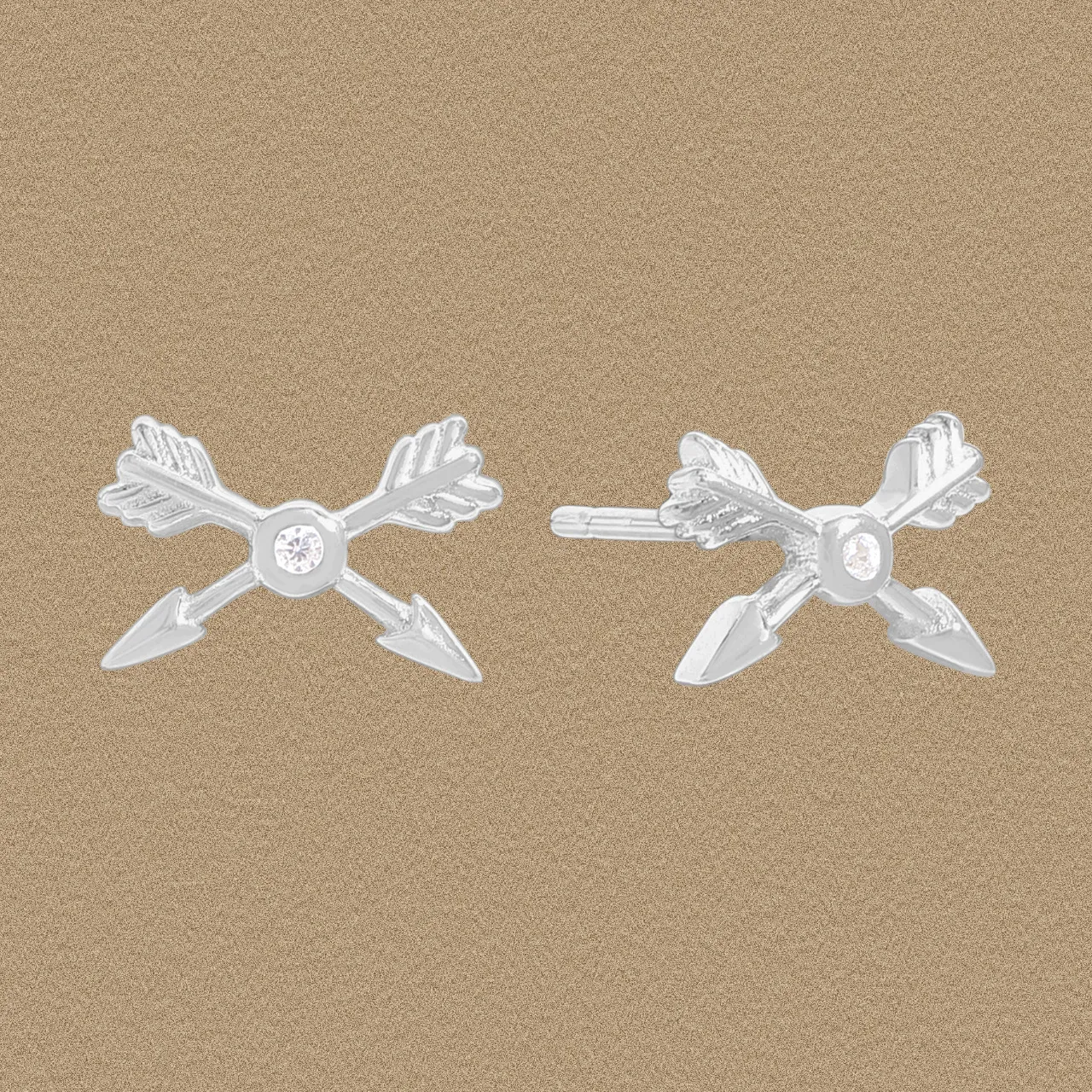 Inspired by the captivating journey through nature and the cosmos, these unique stud earrings are crafted from lustrous, silver-toned metal. Their design features two elegantly crossed arrows, symbolizing direction and wonder, at the heart of which rests a brilliant, clear gemstone.