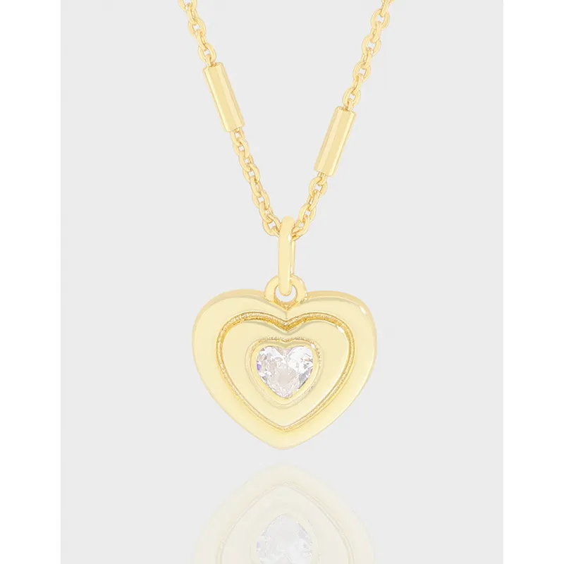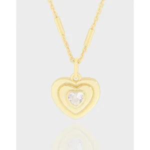 - **Style:** Designed with an elegant, layered heart pendant, this piece showcases a sophisticated depth. The innermost heart cradles a shimmering crystal, creating a focal point of light. The delicate chain features subtle bar accents, adding a unique, modern touch to its timeless appeal, aligning with Malisse’s belief that jewelry should be as fluid and organic as nature itself.