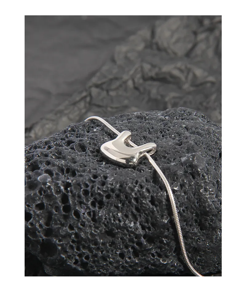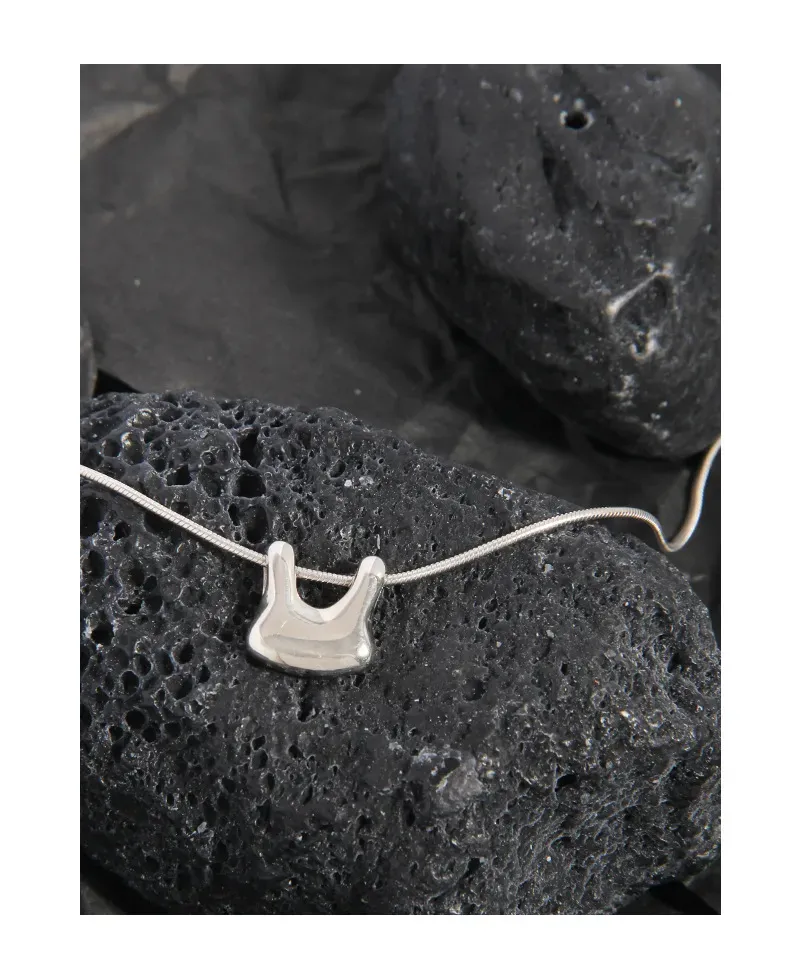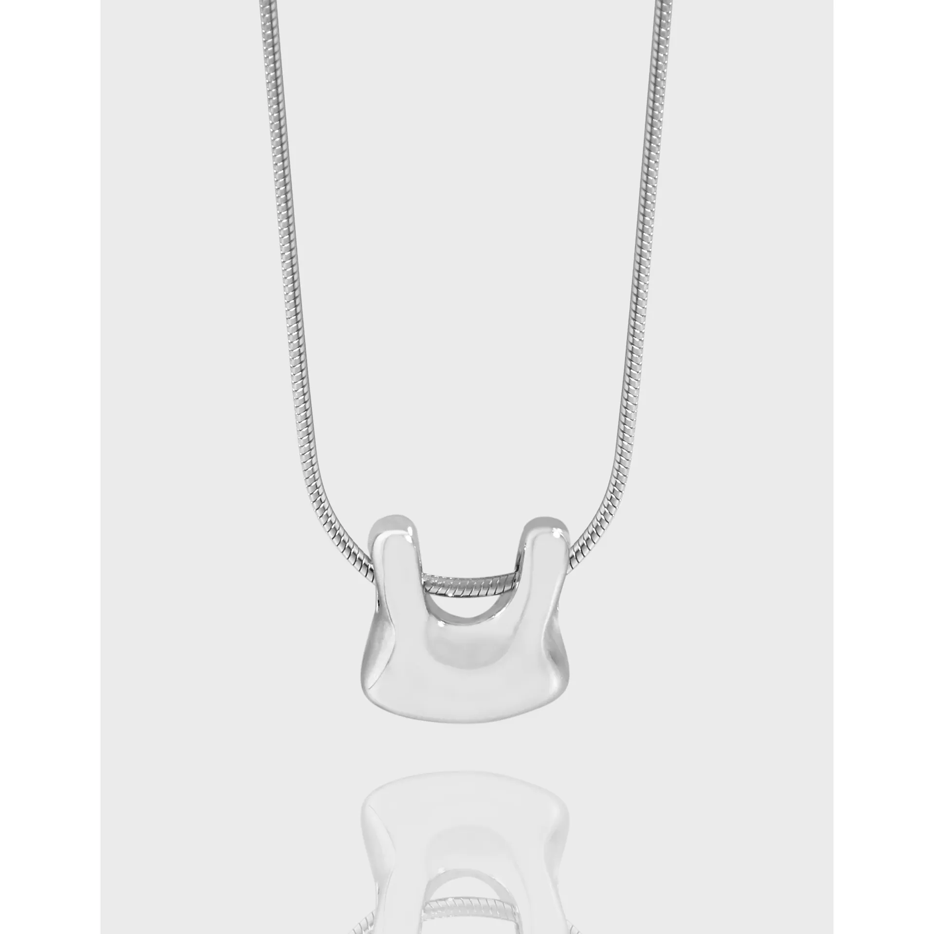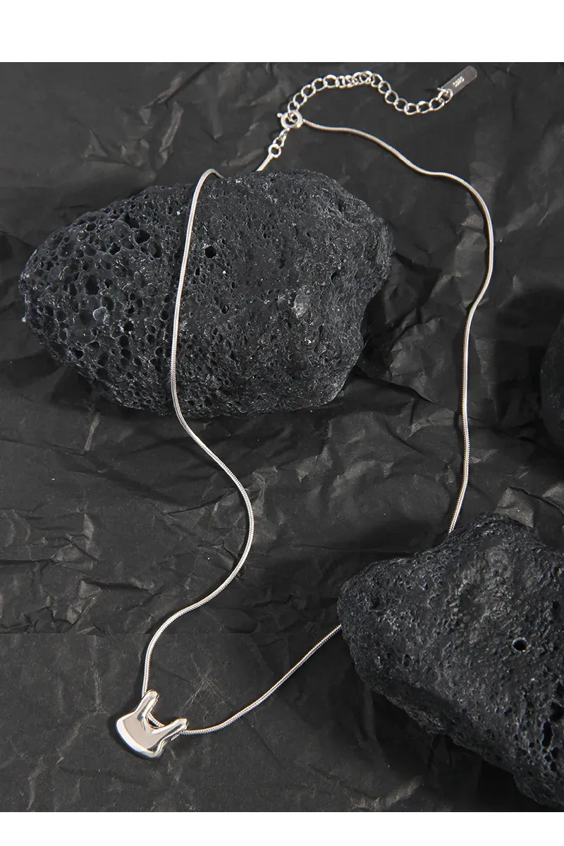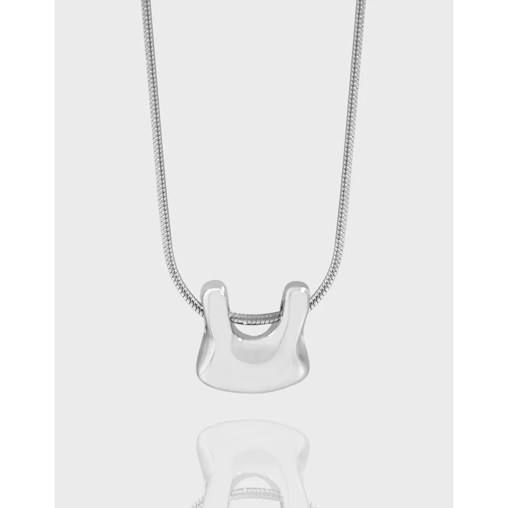 The chain features a finely crafted snake-link texture, presenting a smooth, continuous surface that subtly shimmers and reflects light. The pendant boasts a highly polished, mirror-like finish, free of explicit patterns, allowing its unique, sculpted lines and the play of light to define its captivating texture, aligning with the brand’s ode to “the imperfect beauty of nature’s patterns” through its organic form.