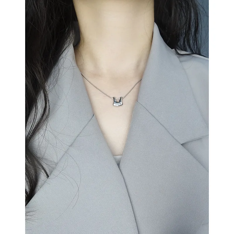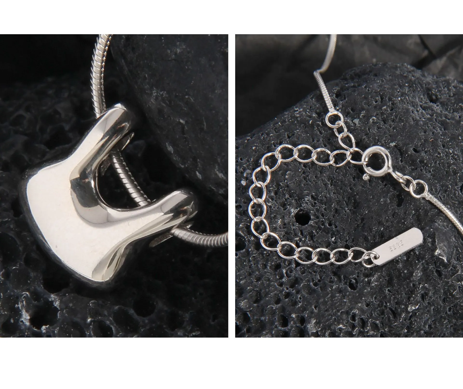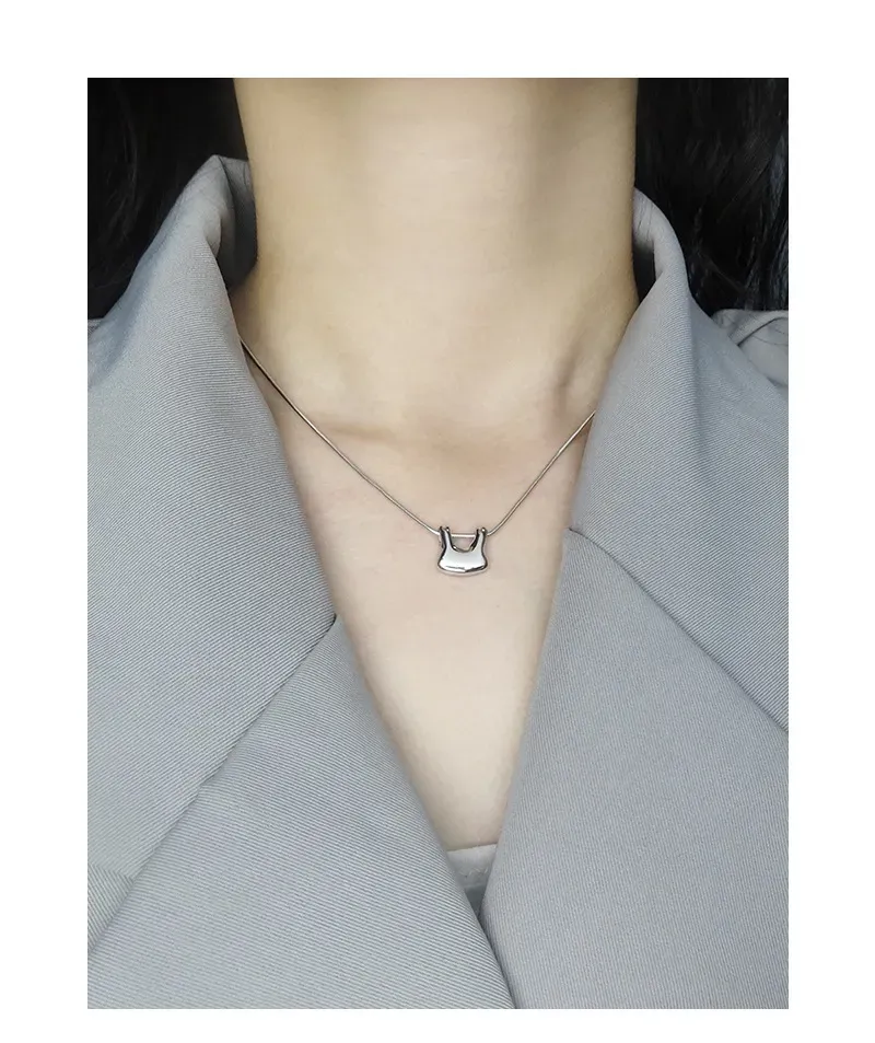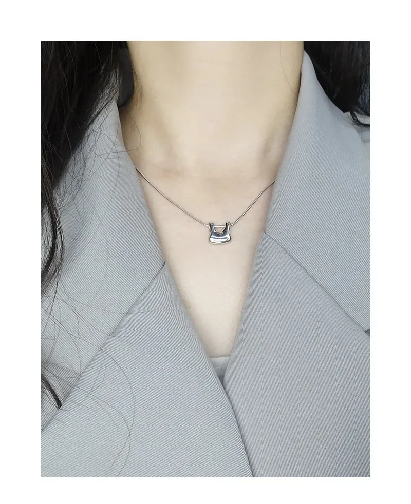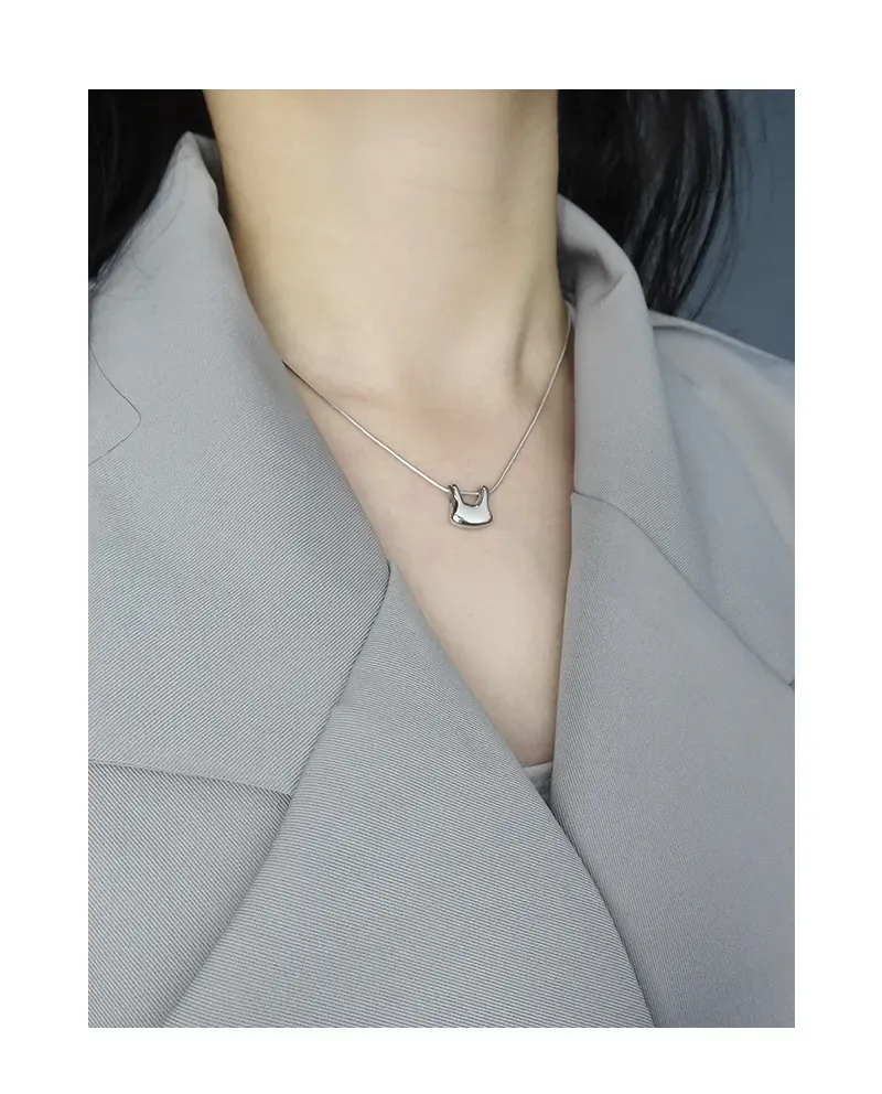 The chain features a finely crafted snake-link texture, presenting a smooth, continuous surface that subtly shimmers and reflects light. The pendant boasts a highly polished, mirror-like finish, free of explicit patterns, allowing its unique, sculpted lines and the play of light to define its captivating texture, aligning with the brand’s ode to “the imperfect beauty of nature’s patterns” through its organic form.
