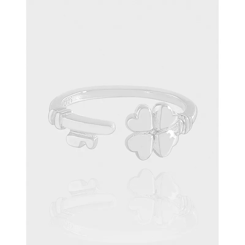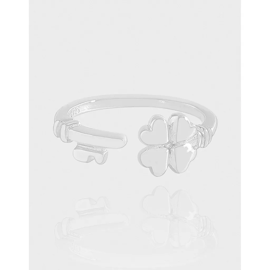 - Patterns & Textures: On one end, a four-leaf clover blossoms, uniquely formed by four tender heart shapes, symbolizing luck and love. Opposite it, a petite, elegantly contoured key represents discovery and new beginnings. Both motifs feature a smooth, polished finish that catches the light, while subtle, raw textures adorn the band where these natural elements intertwine, echoing the imperfect beauty of nature’s artistry. The ring is stamped S925, confirming its premium sterling silver composition.