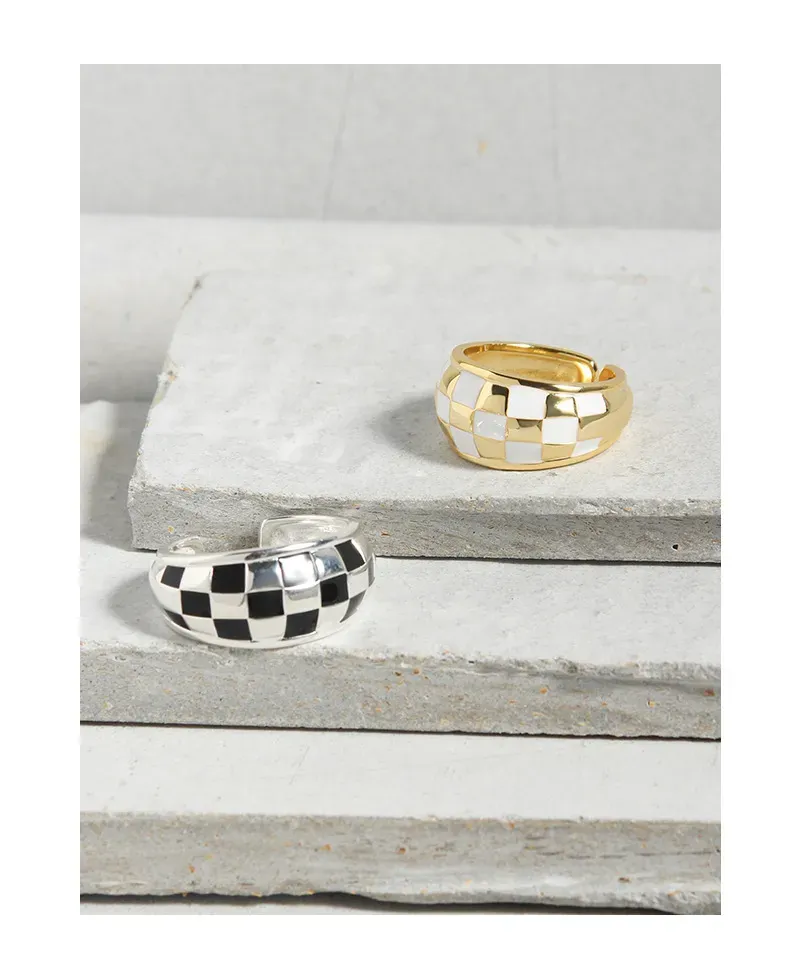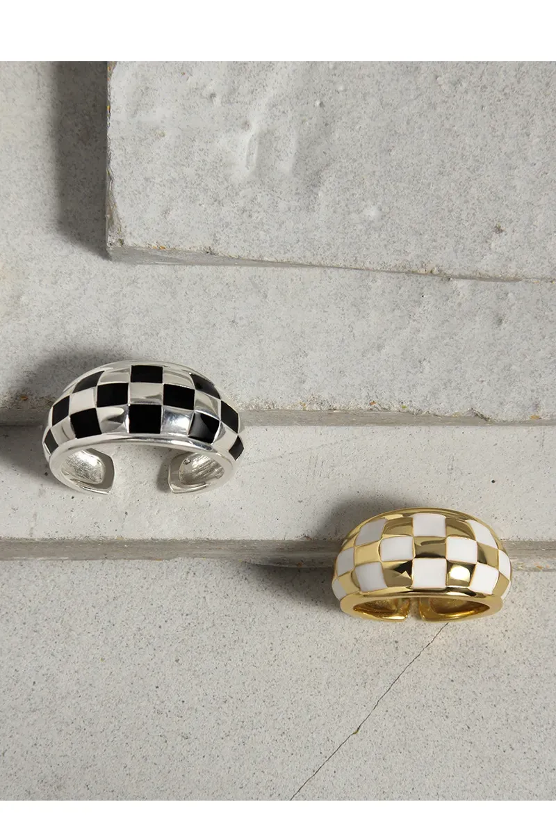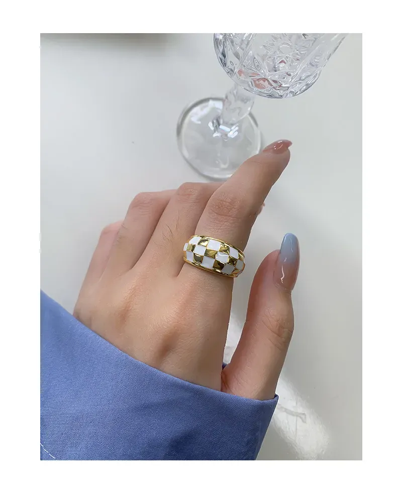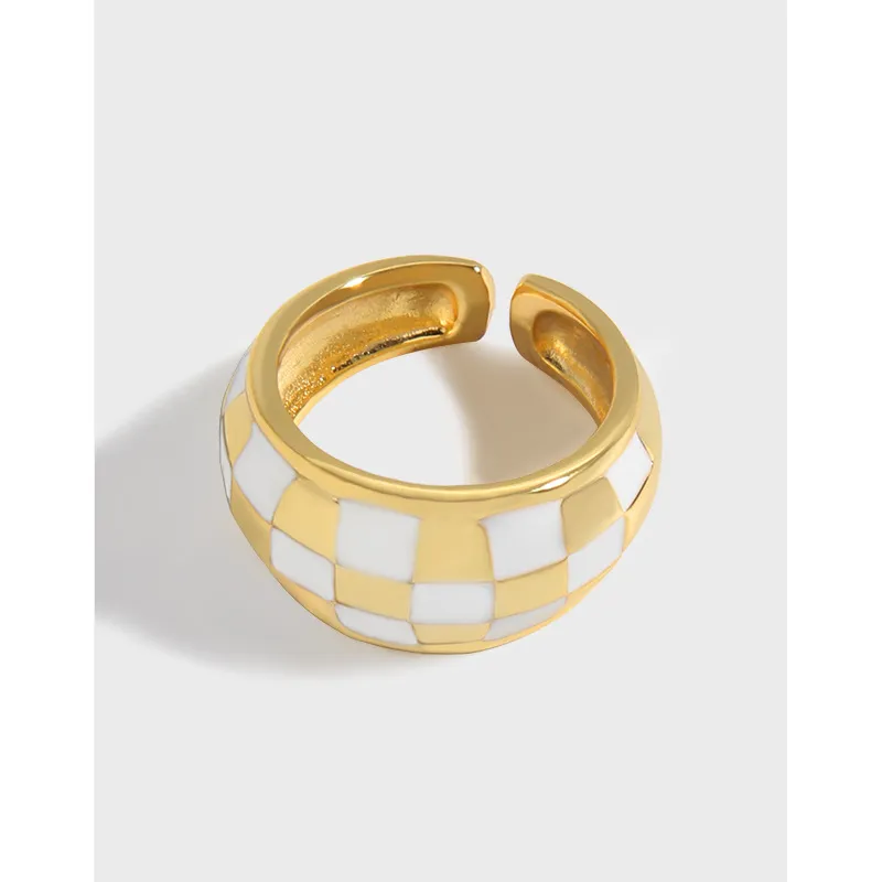 Discover a contemporary design with this open-band ring, meticulously crafted to catch the eye. It showcases a distinctive checkerboard pattern, where lustrous gold squares alternate with crisp, bright white enamel. The smooth, polished finish of both the metal and the enamel creates a sleek texture and a sophisticated visual appeal.