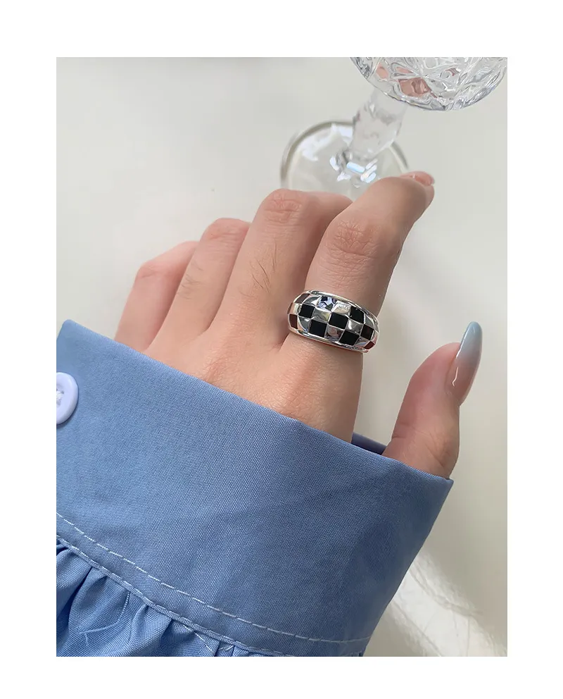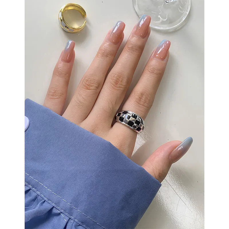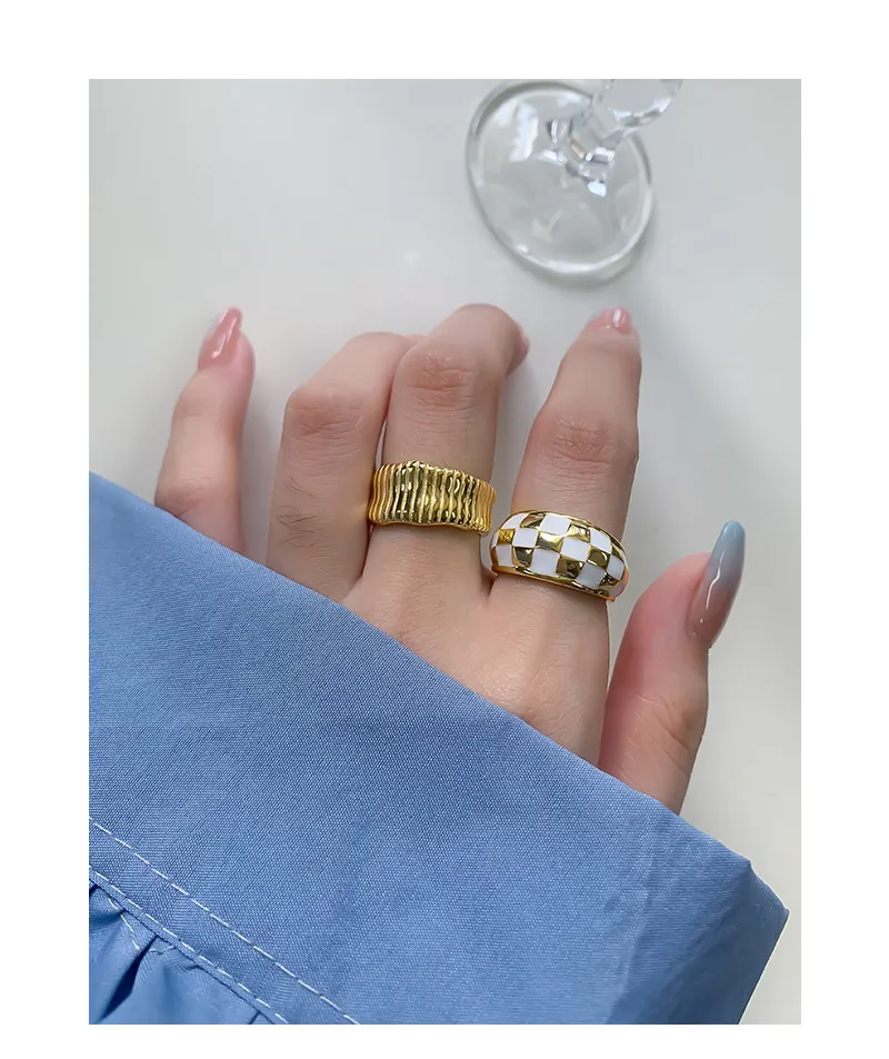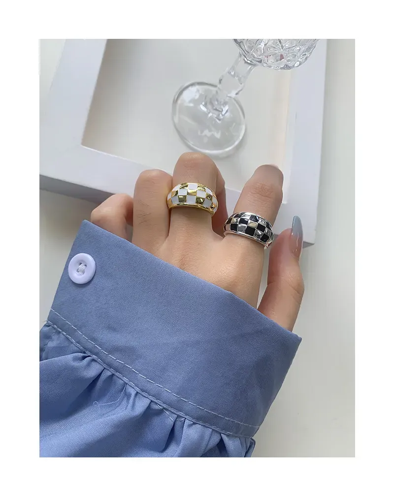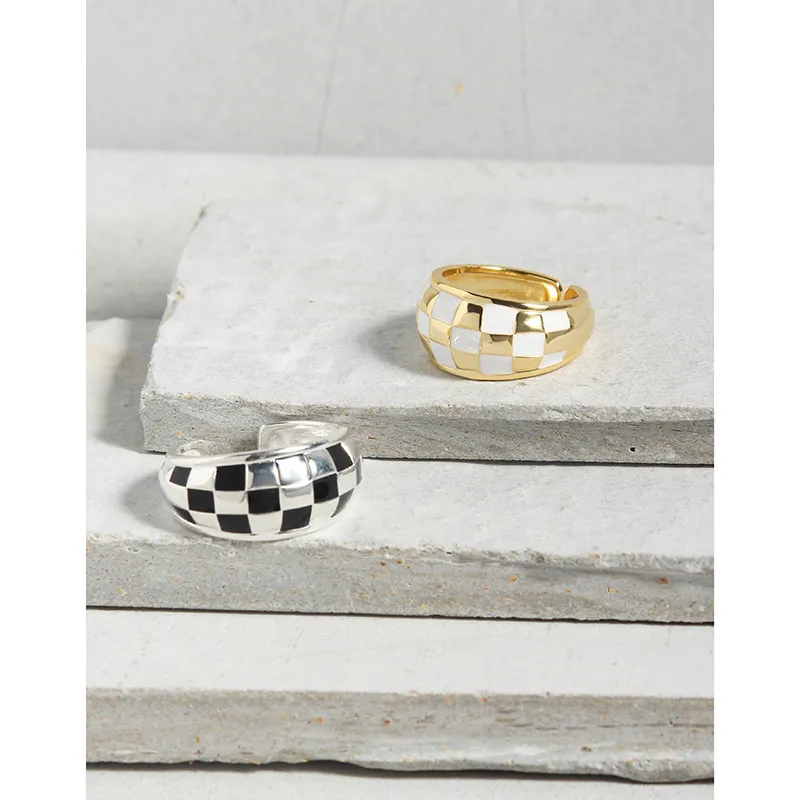 Discover a contemporary design with this open-band ring, meticulously crafted to catch the eye. It showcases a distinctive checkerboard pattern, where lustrous gold squares alternate with crisp, bright white enamel. The smooth, polished finish of both the metal and the enamel creates a sleek texture and a sophisticated visual appeal.
