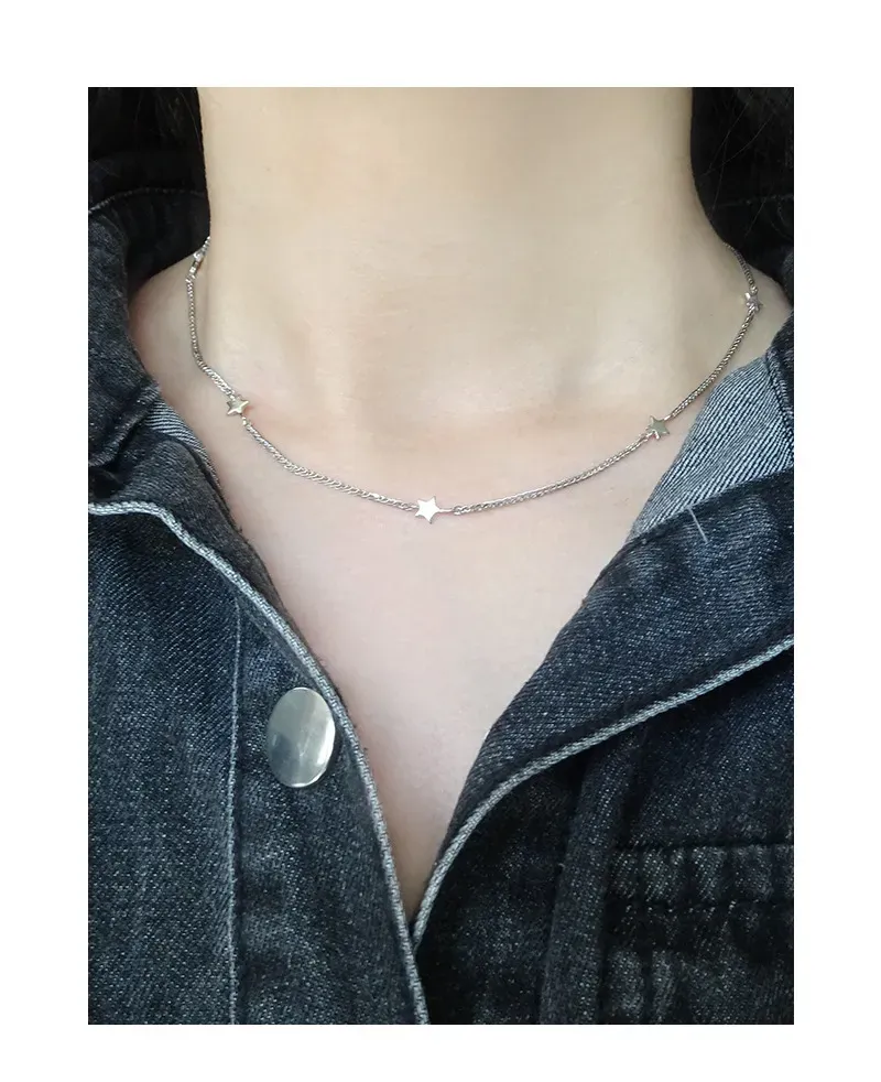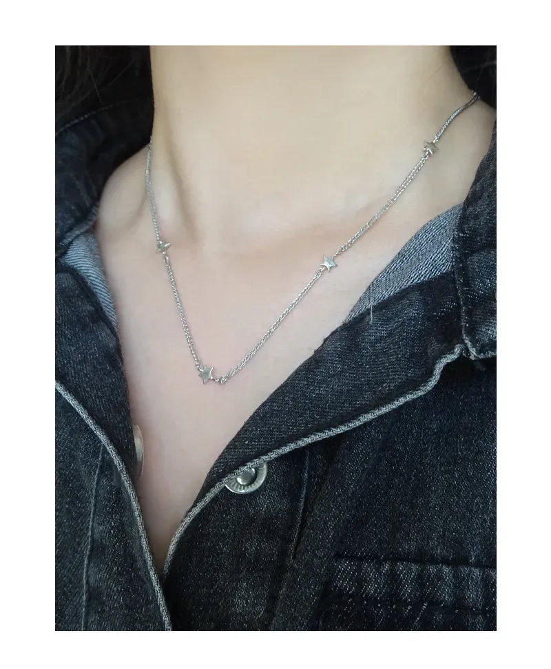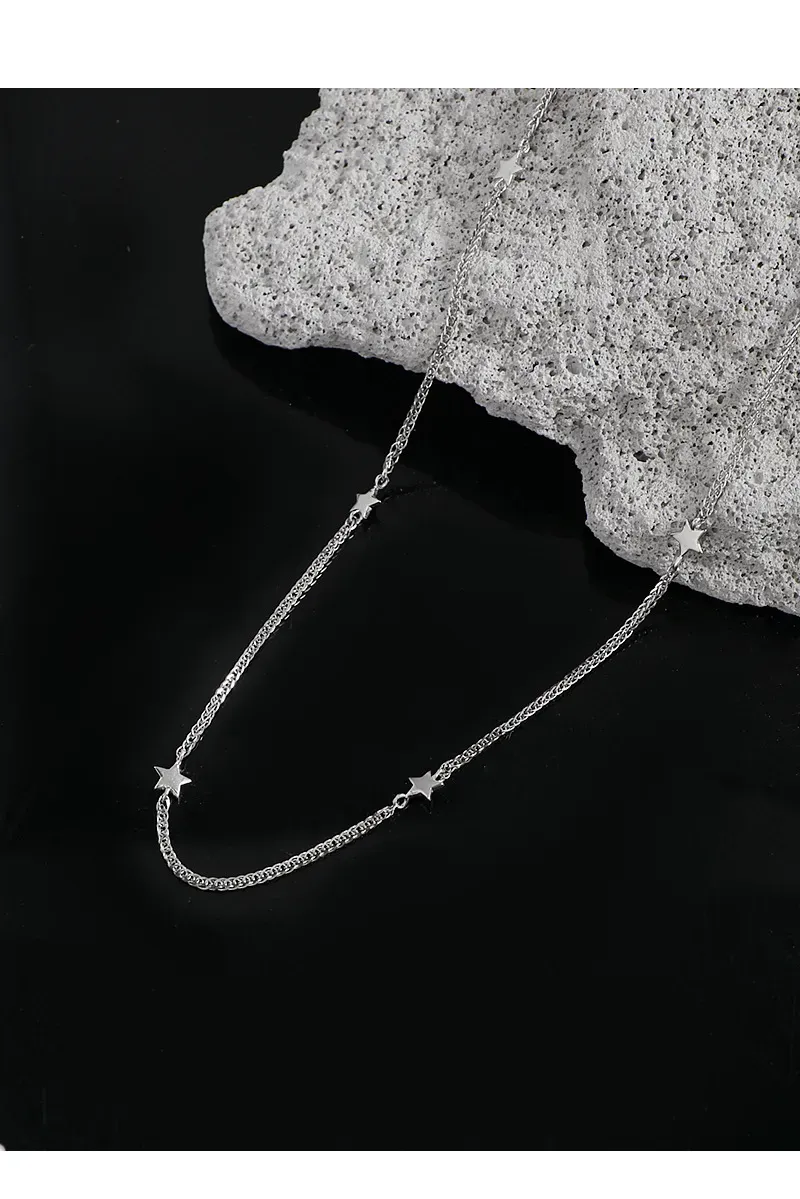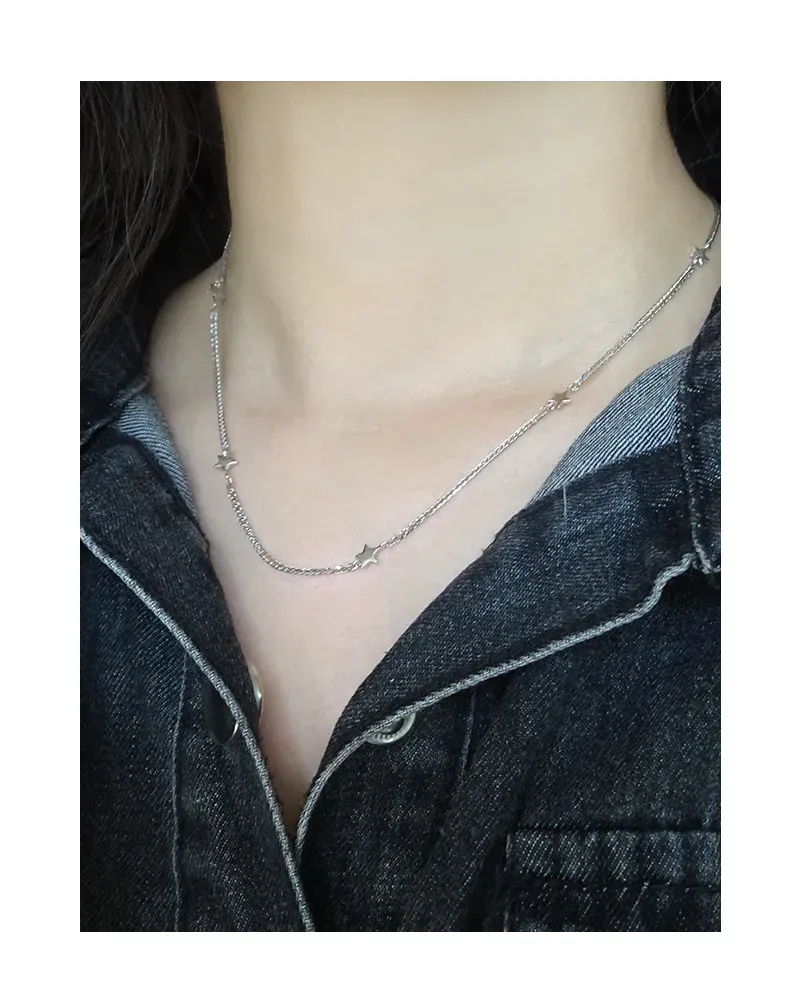 - **Patterns & Textures:** The necklace features an array of small, polished five-point stars, meticulously spaced along a slender chain. Each star possesses a smooth, lustrous texture, embodying the imperfect yet profound beauty found in the night sky’s timeless patterns.