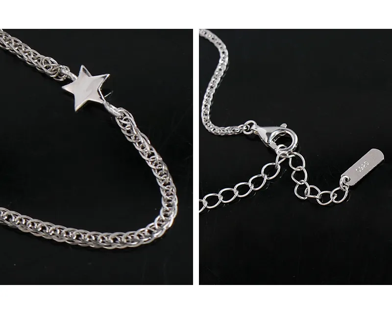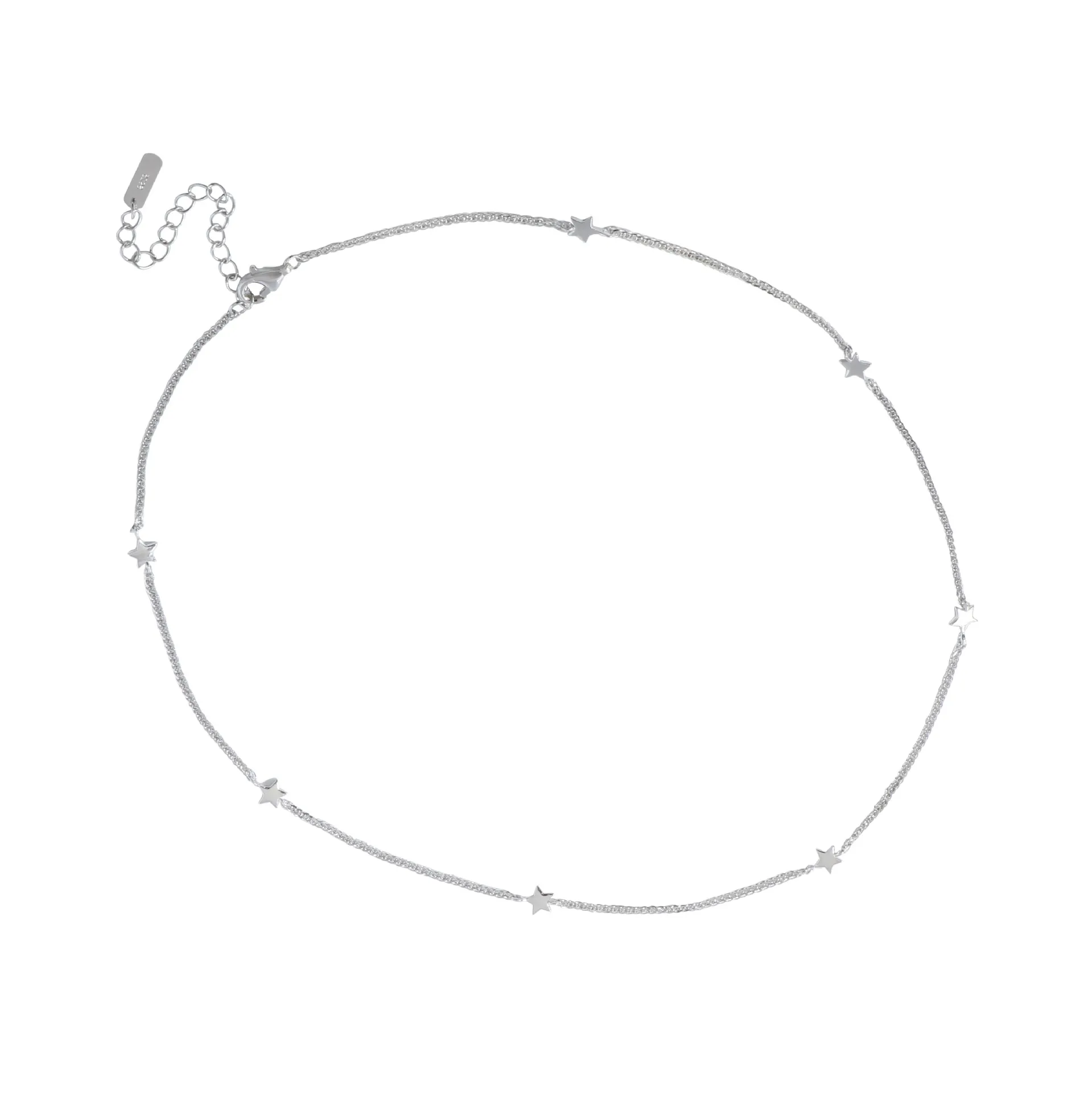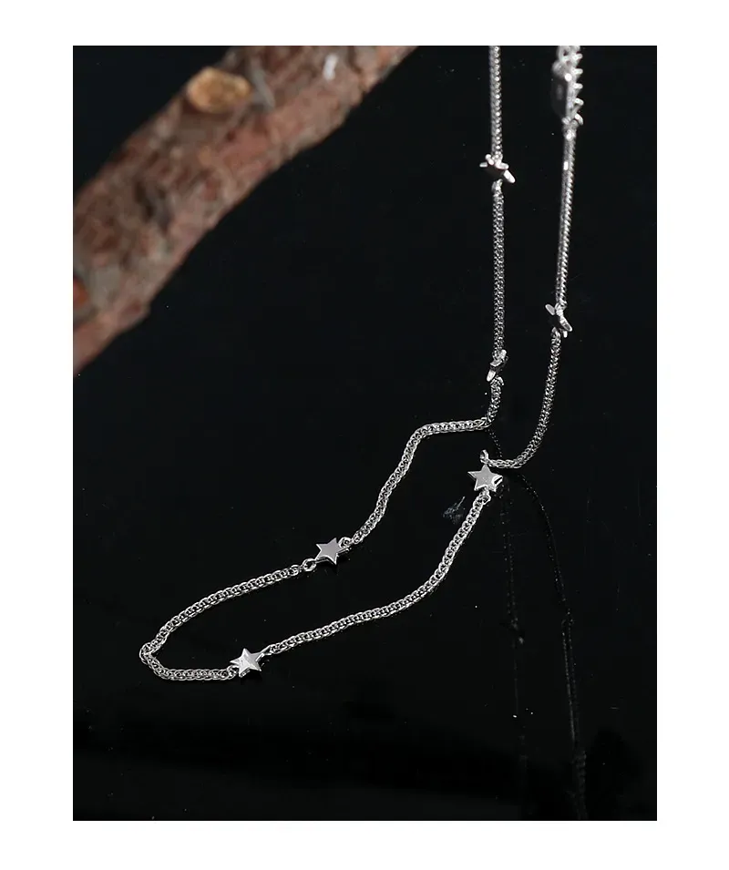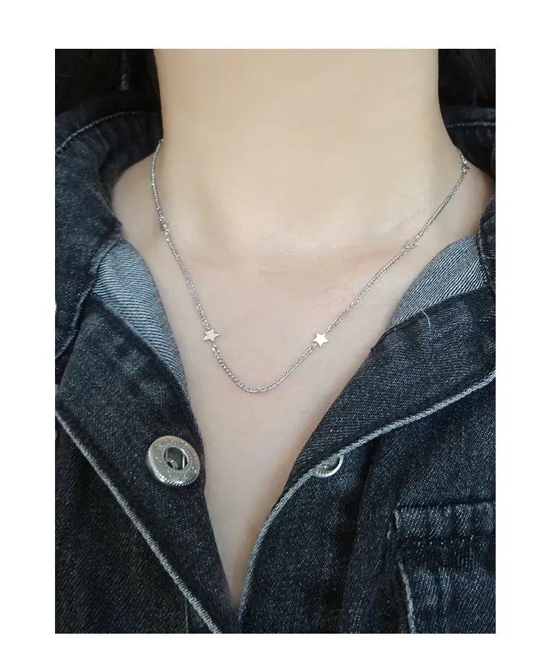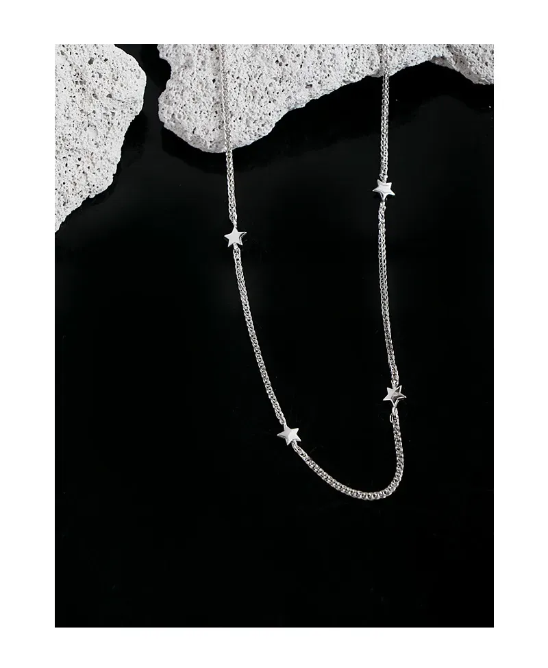 - **Patterns & Textures:** The necklace features an array of small, polished five-point stars, meticulously spaced along a slender chain. Each star possesses a smooth, lustrous texture, embodying the imperfect yet profound beauty found in the night sky’s timeless patterns.