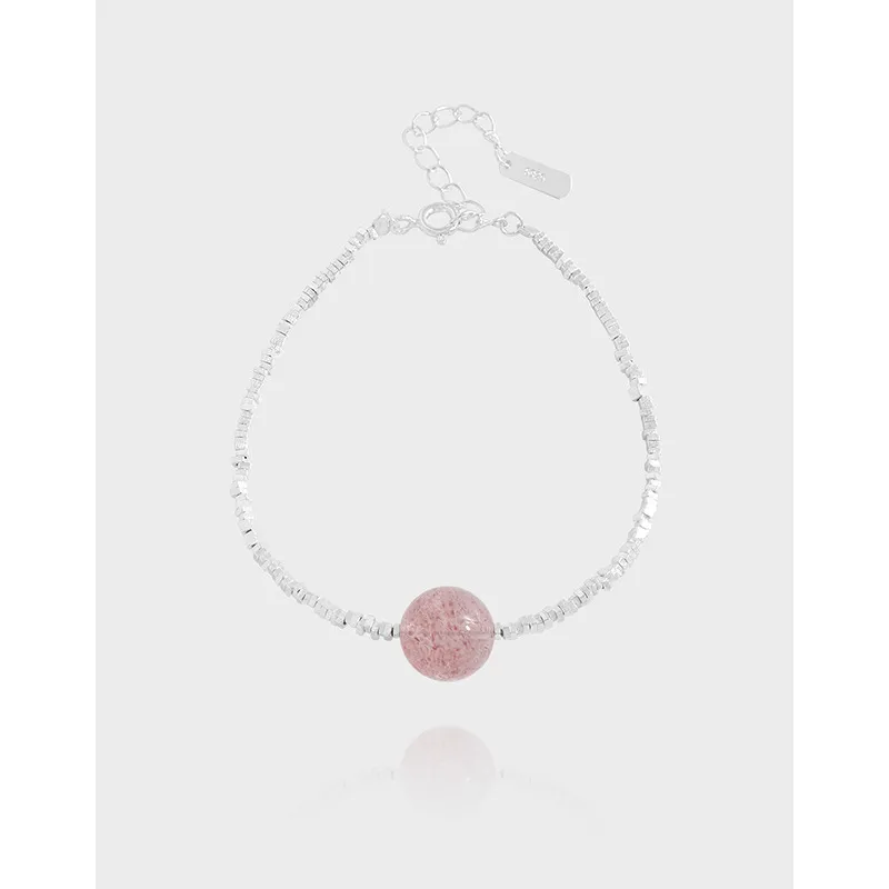 - Color: At its heart lies a captivating, translucent pink strawberry quartz bead, renowned for its delicate rose hue and subtle, sparkling inclusions that shimmer like stardust. The Nasol Bracelet’s chain is crafted from luminous sterling silver, offering a radiant contrast to the gemstone’s soft glow.