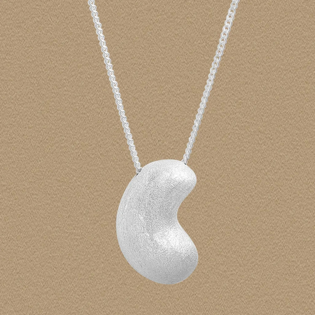 Embrace the enchanting allure of nature with this exquisite Malisse necklace. Its sculptural, fluid form, crafted from shimmering silver, embodies the organic grace found in the world around us. The design evokes the smooth, worn beauty of a river pebble or a celestial seed, capturing the timeless magic that inspires our collection.