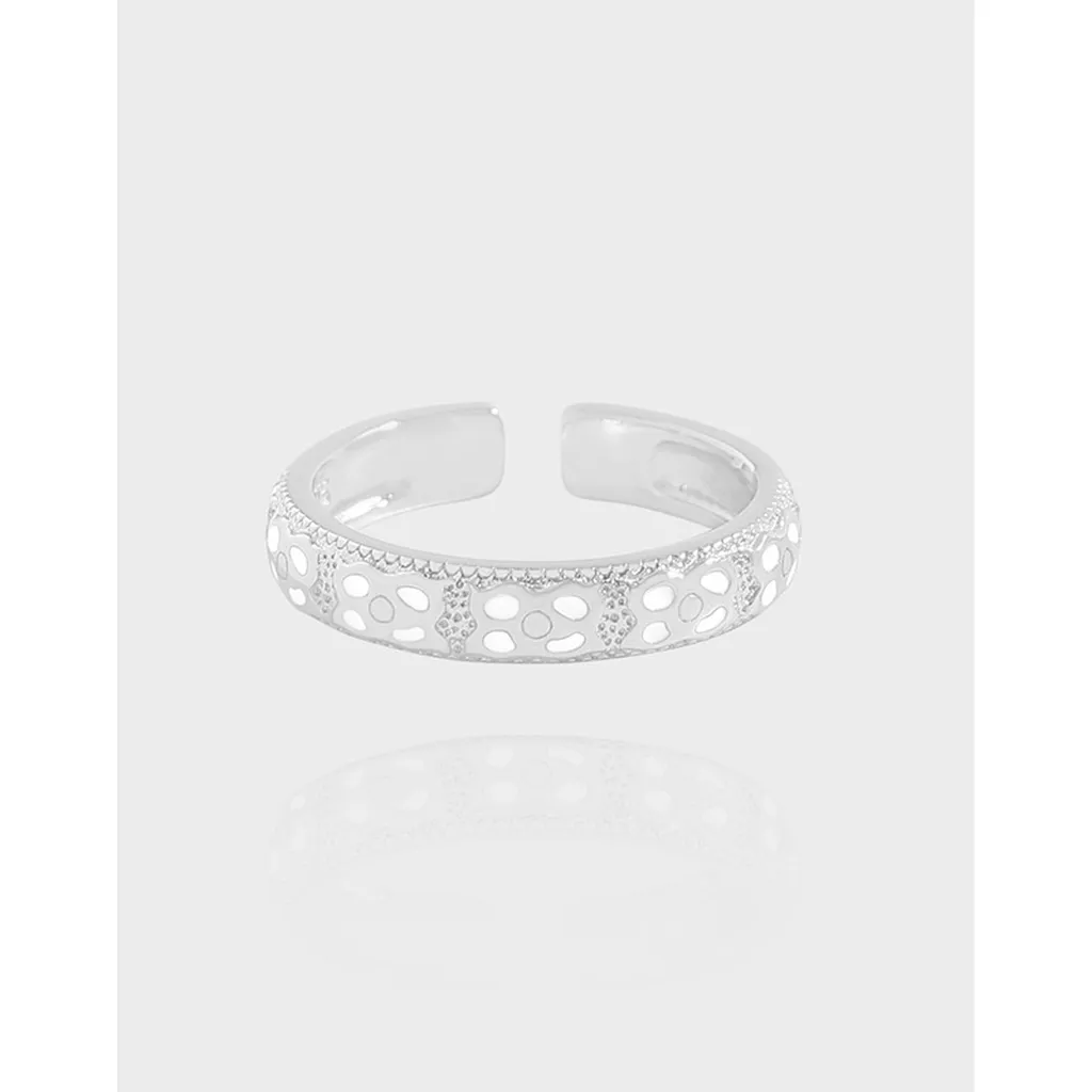 - Patterns & Textures: The Nelunithra Ring’s band is adorned with an intricate, organic pattern of irregular, fluid-like perforations, each meticulously filled with smooth white enamel. This captivating design evokes the gentle shimmer of starlight or light filtering through natural elements. Delicate, almost beaded textures line the edges, adding a subtle dimension and enhancing its raw, yet refined beauty.