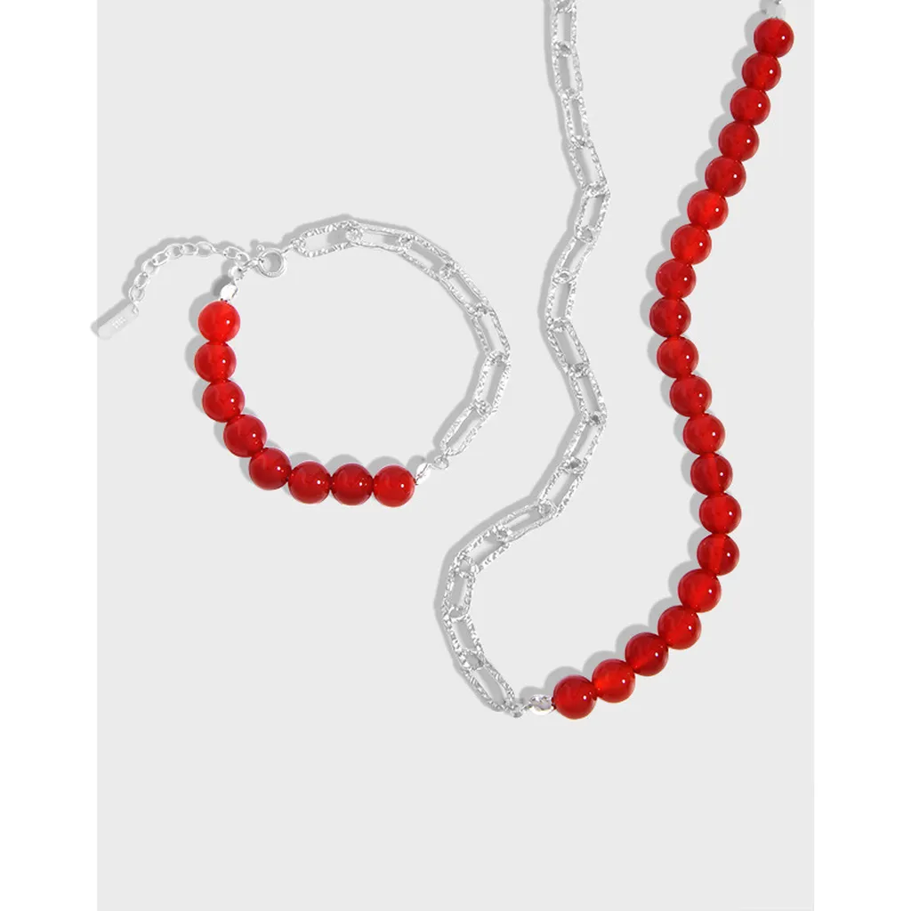 Embrace the vivid charm of nature with this exquisite jewelry set, featuring striking red beads paired with uniquely textured silver links for a truly captivating look.