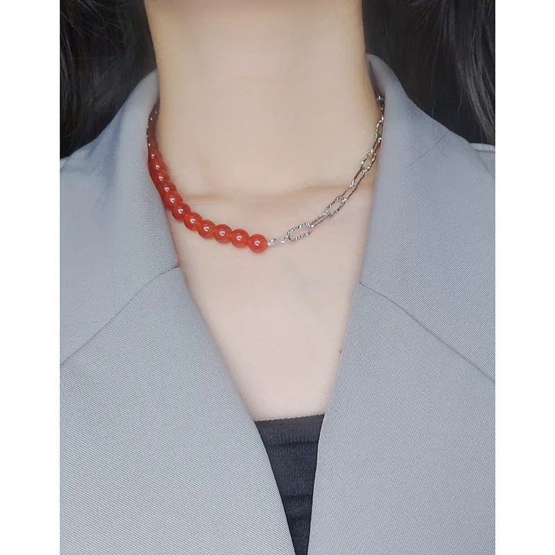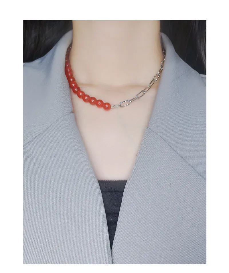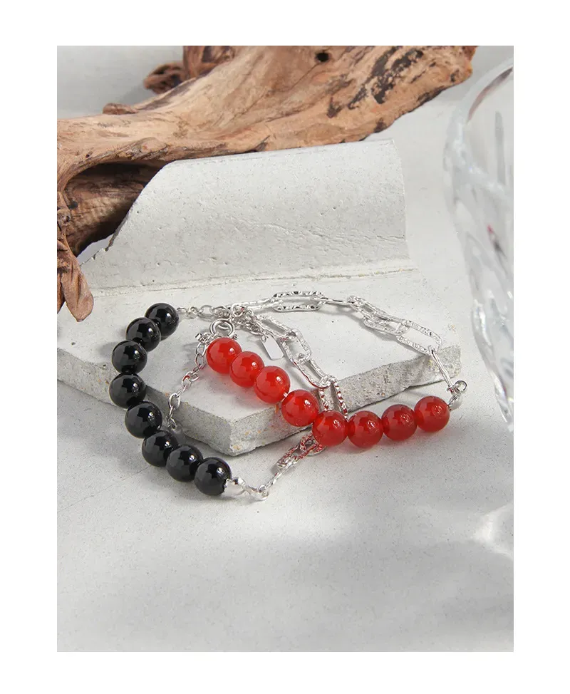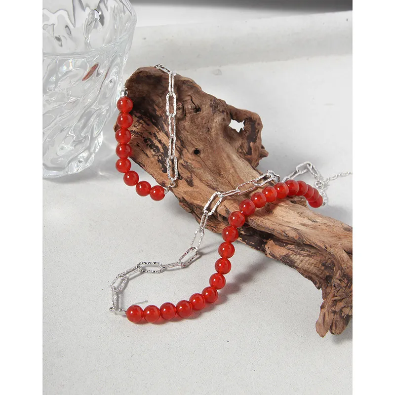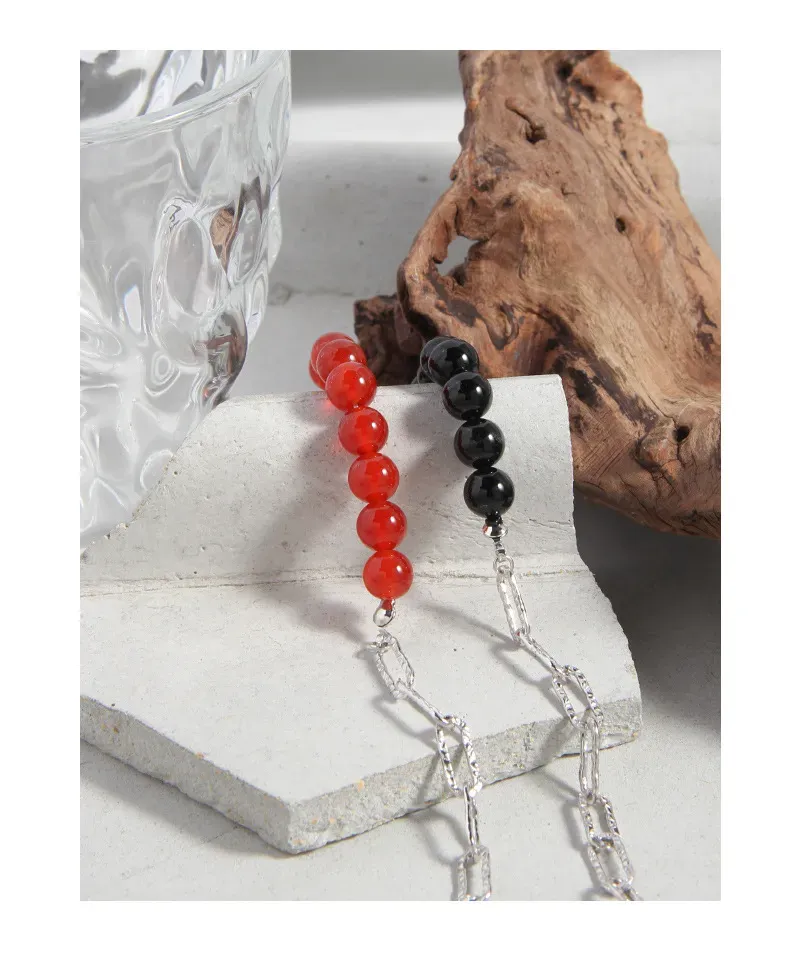 - Patterns & Textures: Smooth, polished red spheres are beautifully complemented by silver chain links, each showcasing an organic, subtly hammered texture that evokes natural beauty.