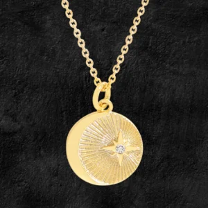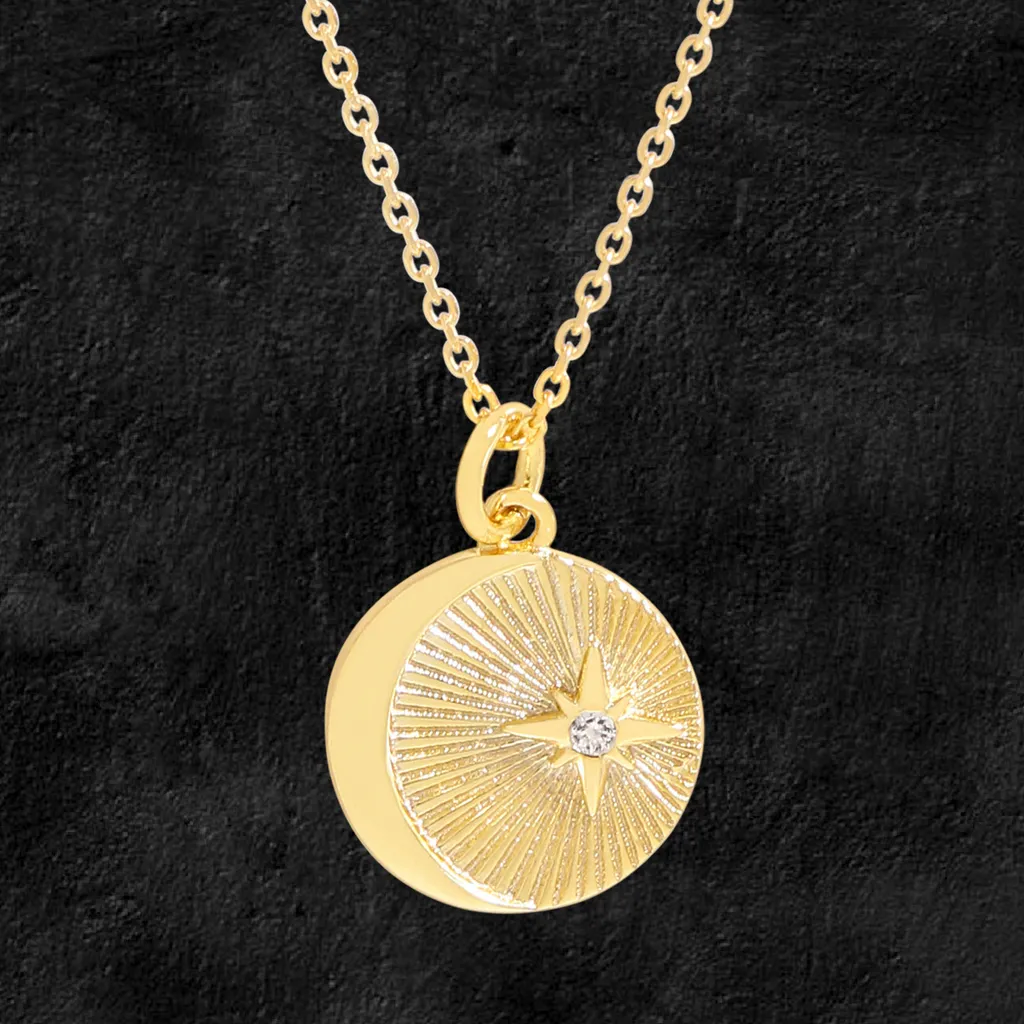 - Patterns & Textures: The prominent round pendant showcases a harmonious interplay of textures. A smooth, polished crescent moon embraces a central disk adorned with finely detailed, radiating lines that evoke powerful rays of light. At its heart, a precisely crafted star glimmers, set with a single, brilliant clear gemstone, symbolizing a guiding light. The delicate chain gracefully complements the pendant, reflecting the fluid and organic artistry of nature.