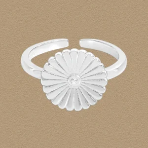 - Patterns & Textures: The central focal point showcases a finely detailed, sculpted bloom with delicate radial lines, reminiscent of a blossoming flower or a shimmeNovia Ring sunburst. A single, sparkling gemstone nestles at its heart, adding a touch of celestial brilliance and depth to its raw textures and imperfect beauty.