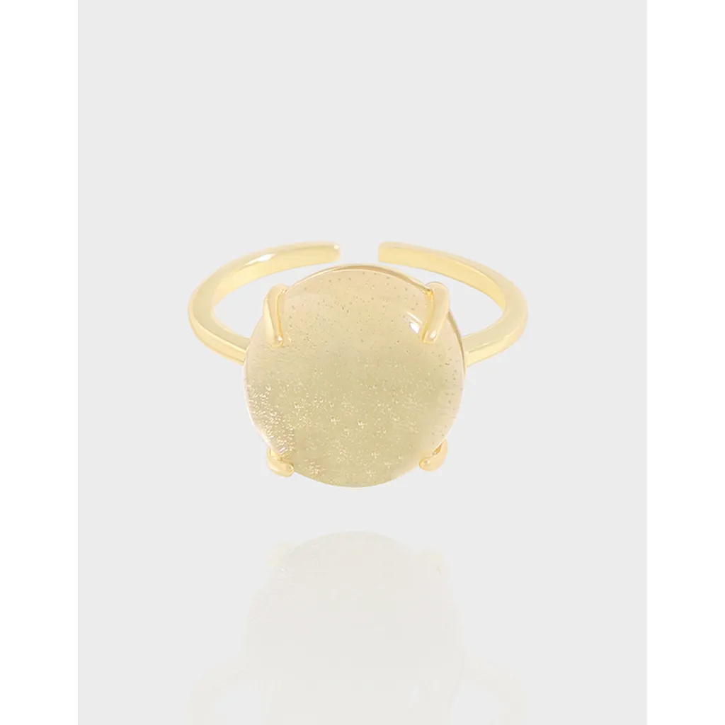 Embrace timeless elegance with this captivating adjustable ring. Crafted with a gleaming gold-toned band, its design features a prominent oval cabochon. The centerpiece boasts a unique, subtly textured and frosted surface, creating a soft, diffused glow that beautifully reflects light. This Nutrina Ring perfectly embodies Malisse’s appreciation for raw textures and the fluid artistry of nature, offering a piece that is both understated and enchanting.