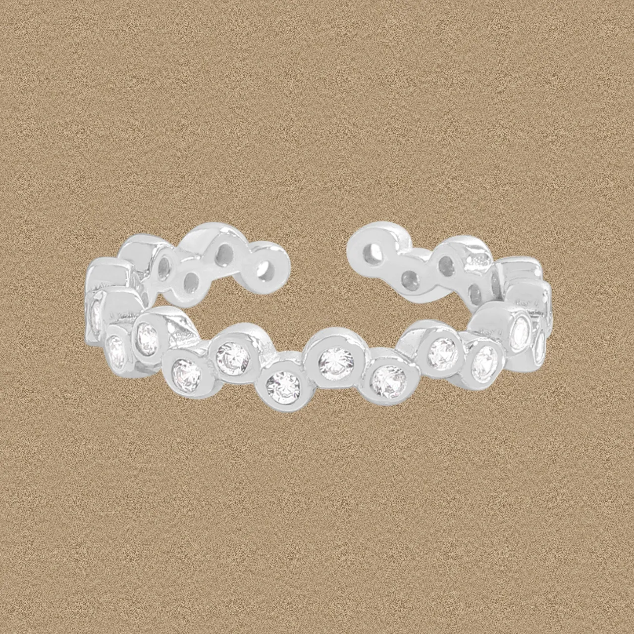 • Patterns & Textures: A captivating sequence of smooth, rounded silver settings intersperses with precisely bezel-set clear stones. This continuous bubble-like pattern evokes the delicate shimmer of dew drops or the scattered brilliance of the aurora borealis, creating a tactile and visually rich texture that celebrates the imperfect beauty of nature’s artistry.