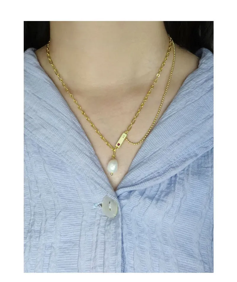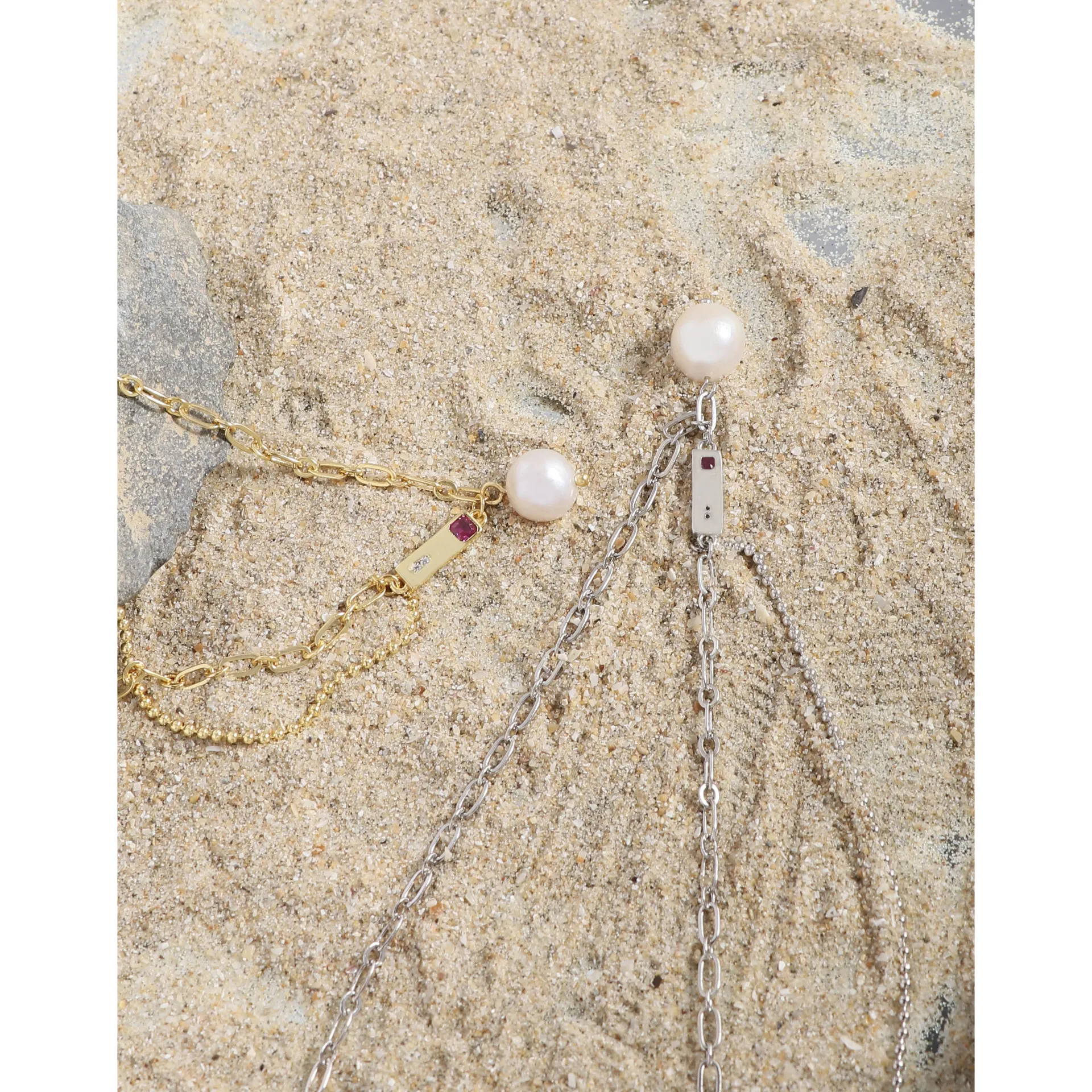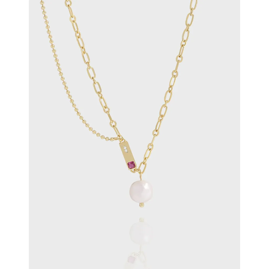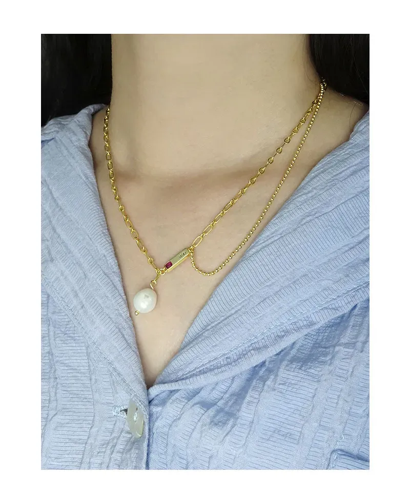 • Style & Design: This modern layered design showcases a bold paperclip chain interwoven with a delicate beaded chain, creating a harmonious blend of styles. The chains converge at a sleek gold bar adorned with the ruby and clear stones, culminating in a captivating, organically shaped freshwater pearl drop.