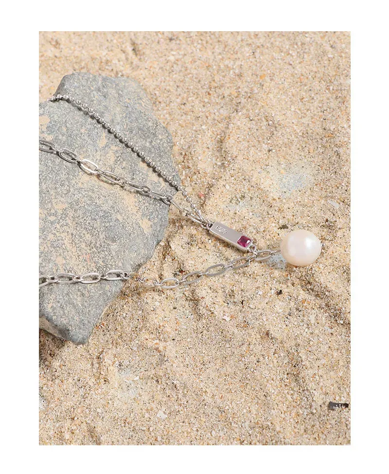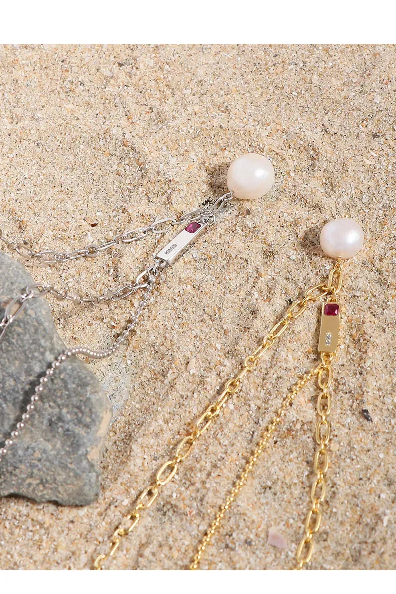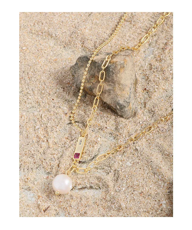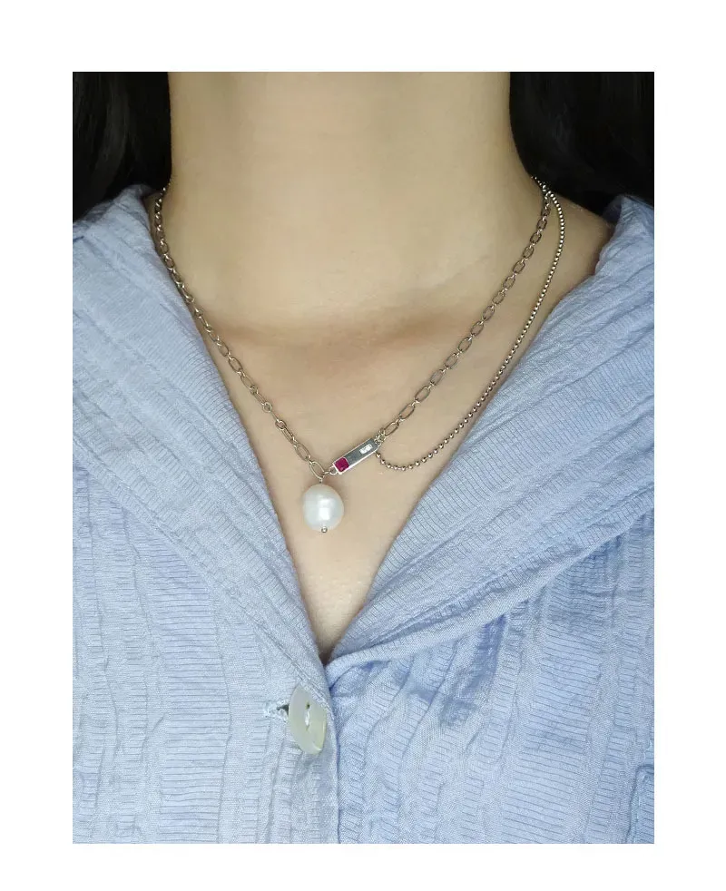 • Style & Design: This modern layered design showcases a bold paperclip chain interwoven with a delicate beaded chain, creating a harmonious blend of styles. The chains converge at a sleek gold bar adorned with the ruby and clear stones, culminating in a captivating, organically shaped freshwater pearl drop.