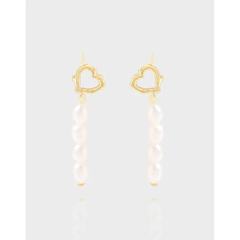 - Patterns & Textures: Each earring showcases a distinct, irregular heart shape in gold, crafted with an organic, molten-like texture that reflects the imperfect beauty of nature’s patterns. Three elongated, smooth freshwater pearls gracefully cascade below, adding a touch of natural brilliance.
