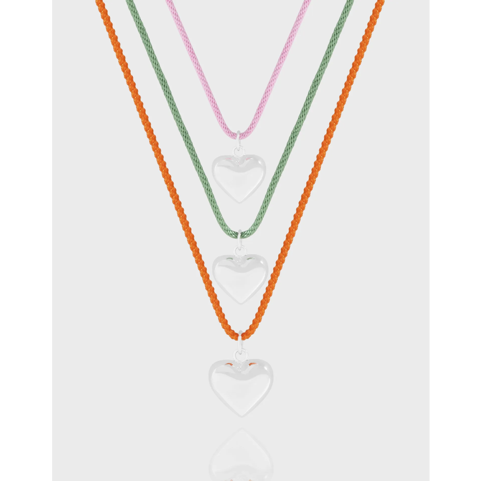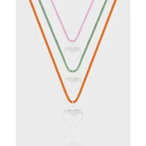 - Color: This set features three distinct Oelynthra Necklaces, each showcasing a unique, vibrant hue. Discover a delicate soft pink, a fresh verdant green, and a radiant orange cord, each complemented by a clear, lustrous heart pendant.