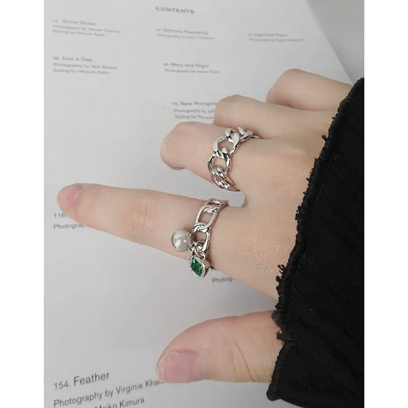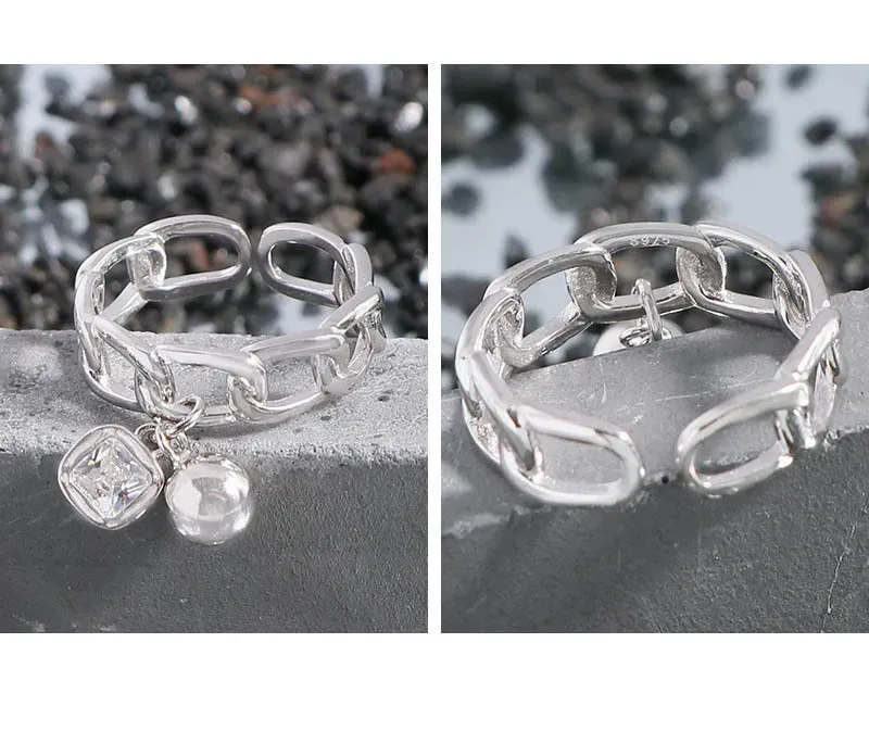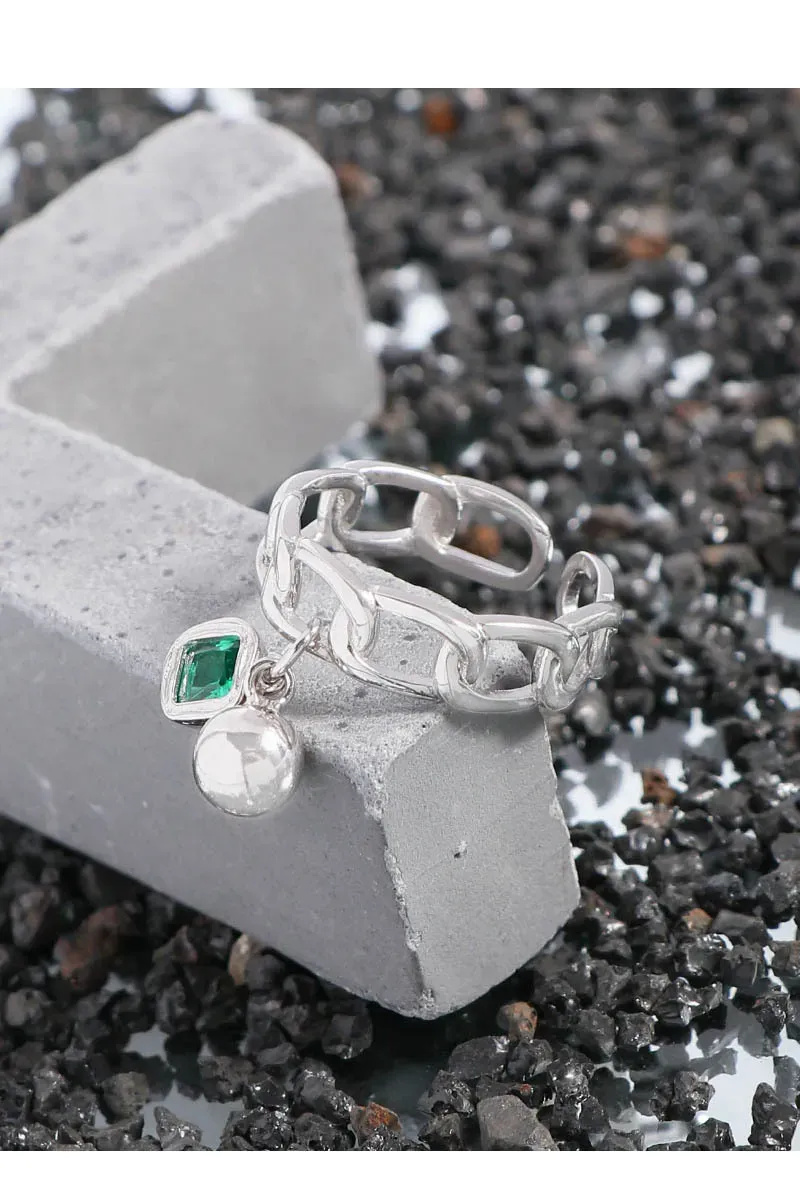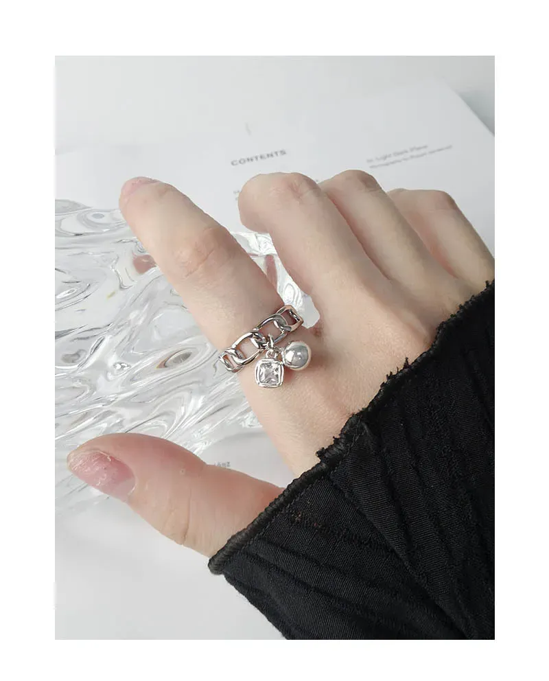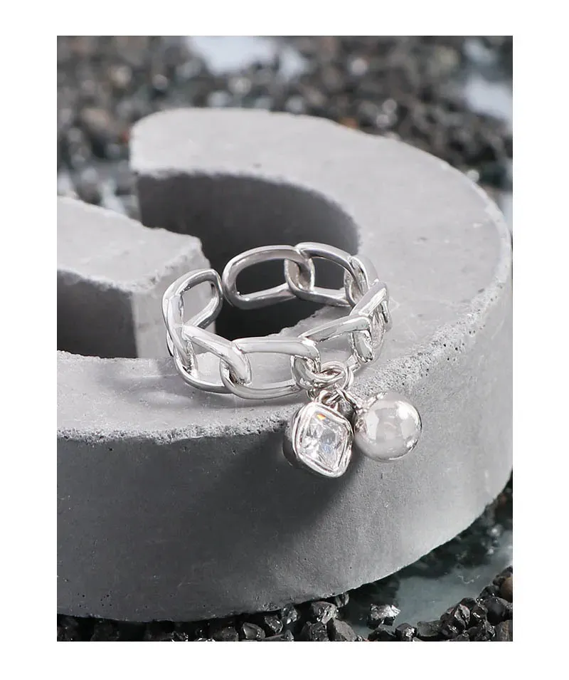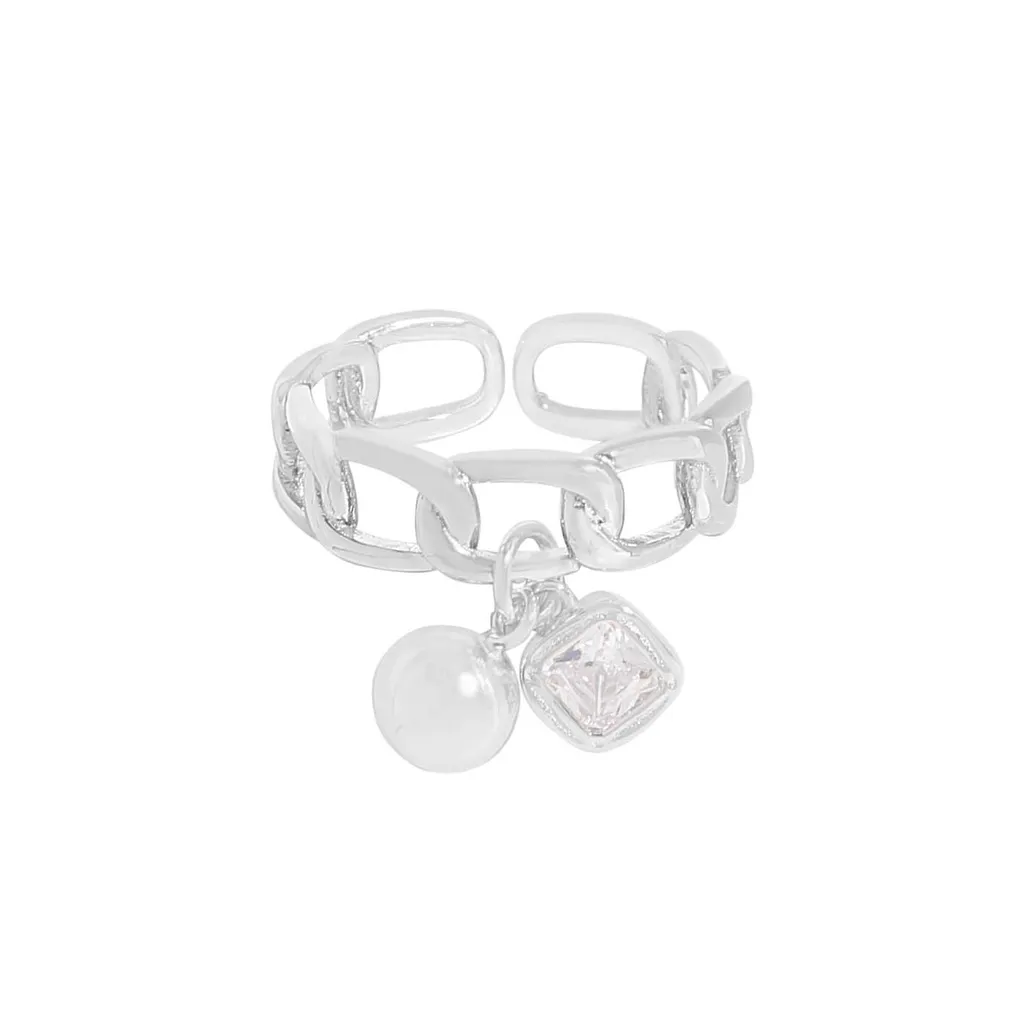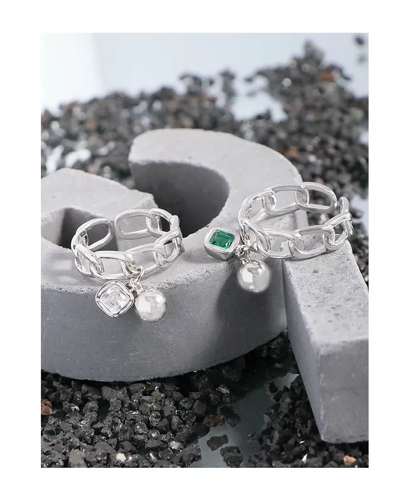 • **Style:** A chic, open-ended chain link band forms the foundation, offering easy adjustability and a modern aesthetic. Two elegant charms dangle gracefully: a smooth, spherical pearl-like element and a square-cut, prong-set gemstone, creating a playful yet sophisticated silhouette.