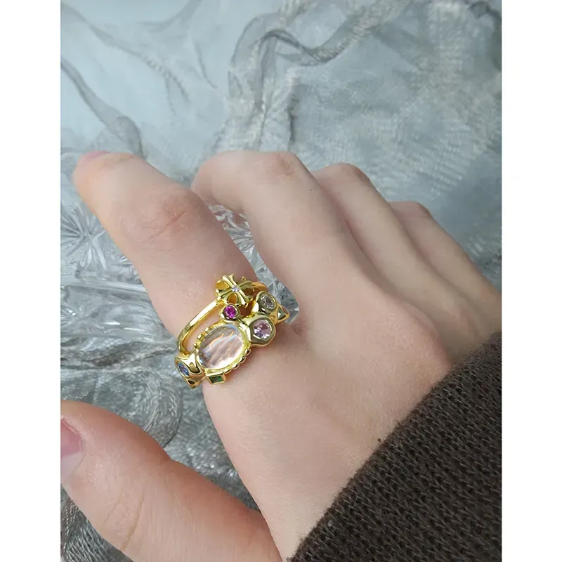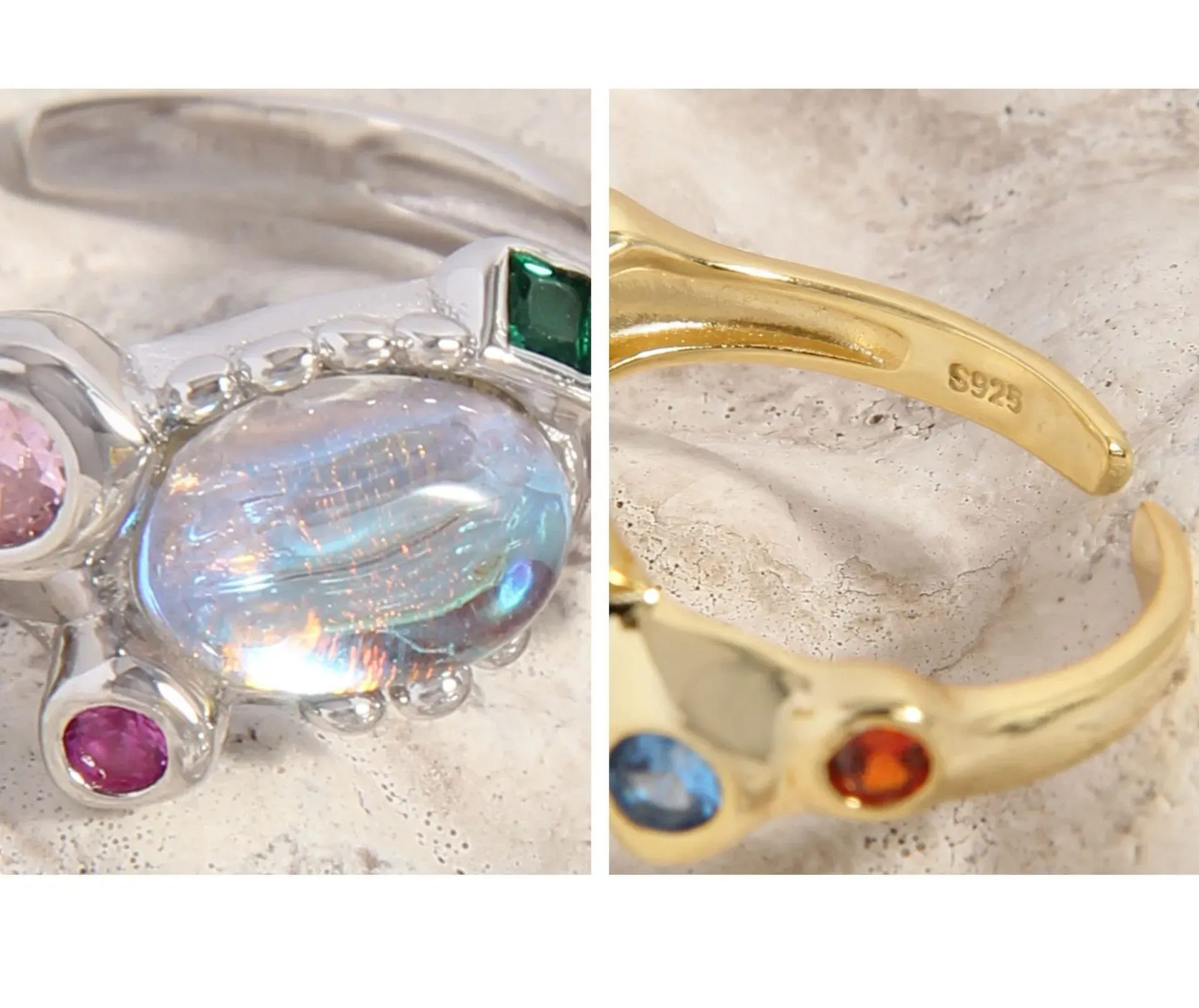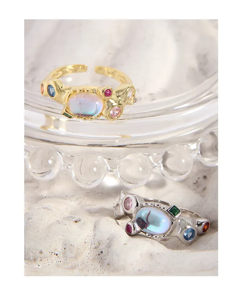 • Color: Crafted in a radiant gold tone, this piece features a captivating oval opal at its heart, shimmeOrelia Ring with iridescent flashes of blue, pink, and white. It is beautifully complemented by an array of smaller, vibrantly colored gemstones including clear, delicate lavender, rich ruby red, striking emerald green, and serene sky blue, creating a harmonious palette of celestial hues.